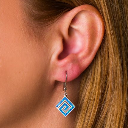 Greek Key Blue Opal Dangle Earrings