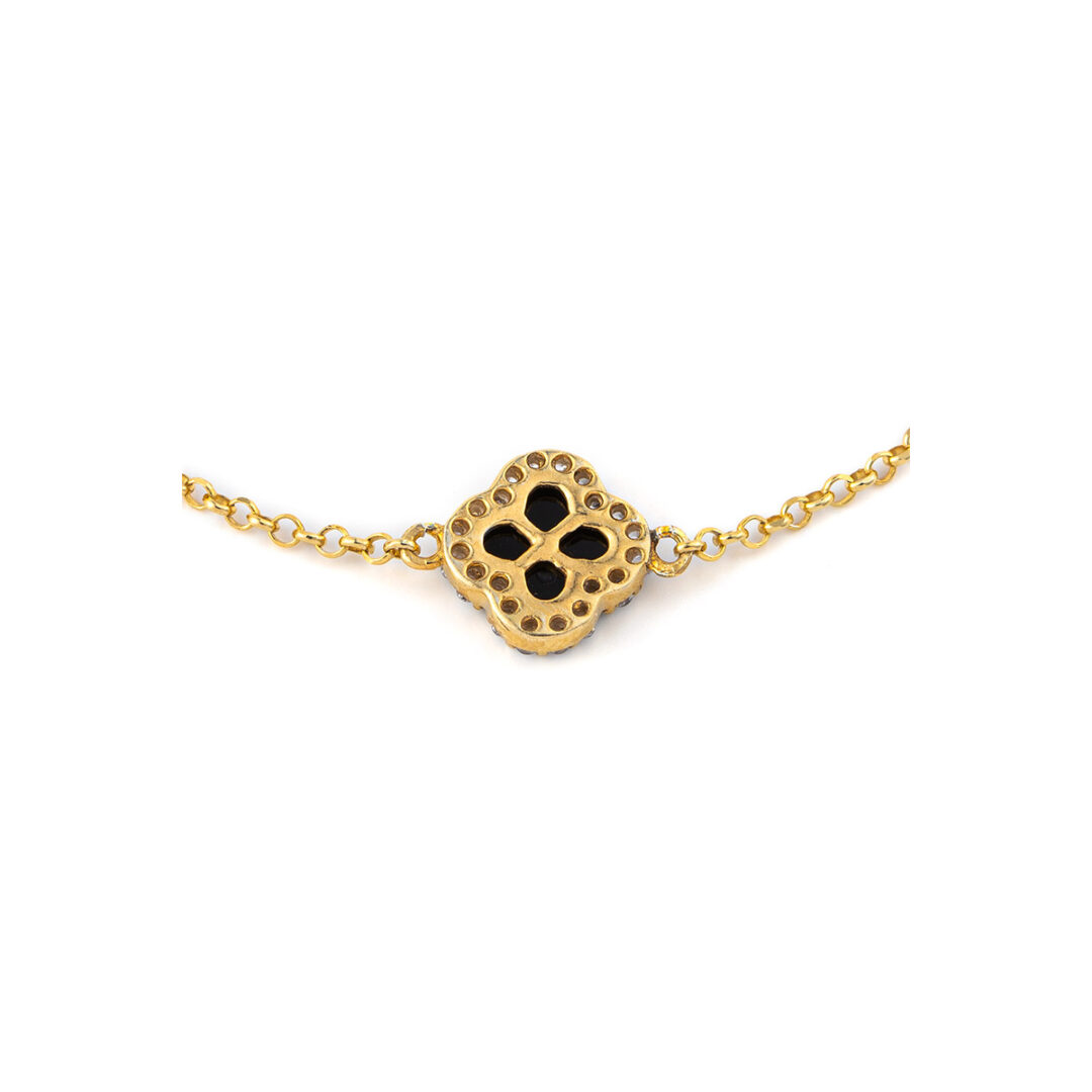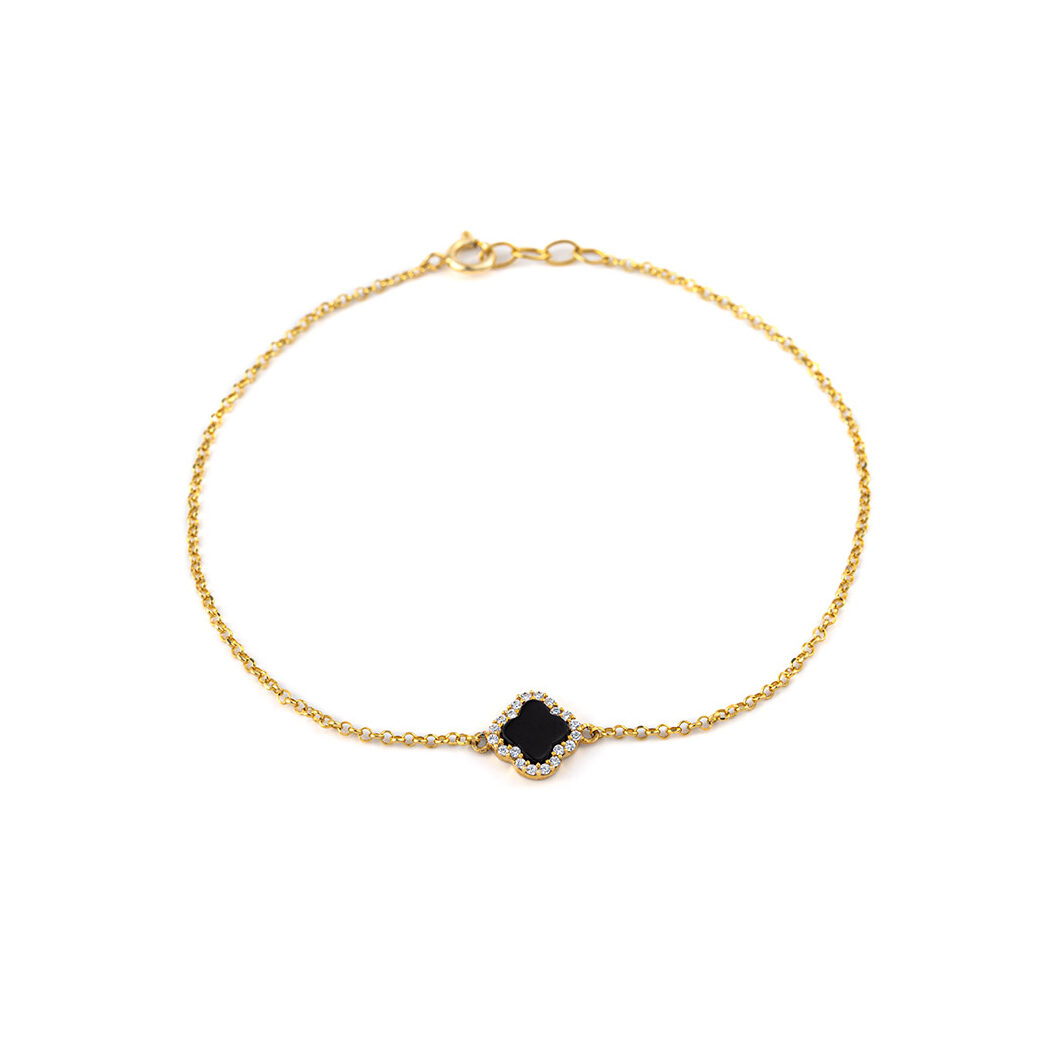 Βραχιόλι κόσμημα κατασκευασμένο από ασήμι 925ο επιχρυσωμένο που αποτελείται από έναν σταυρό από μαύρο όνυχα και είναι διακοσμημένος με λευκές πέτρες ζιργκόν.