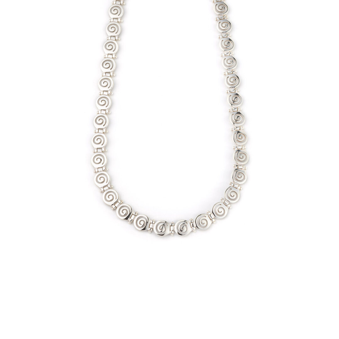 Κολιέ εμπνευσμένο από το αρχαίο σύμβολο της σπείρας. Αυτού του τύπου ο σχεδιασμός ονομάζεται επίσης “ο κύκλος της ζωής”. Η σπείρα είναι ένα από τα αρχαιότερα σύμβολα της ανθρώπινης πνευματικότητας, χαραγμένο ή ζωγραφισμένο σε βράχους εδώ και χιλιάδες χρόνια. Είναι σύμβολο της κίνησης και της προοδευτικής ανάπτυξης, της ανάπτυξης, της επέκτασης, της κοσμικής ενέργειας, σύμβολο του ήλιου. Σπείρες έχουν βρεθεί σε ταφικούς χώρους, σε βάζα, σε κοσμήματα, ρούχα, όπλα… Μπορούν να παρατηρηθούν σε κάθε πτυχή της φύσης, όπως οι παλίρροιες στους ωκεανούς, οι άνεμοι, τα φυτά, τα κοχύλια. Το φαινόμενο της σπείρας έχει εξηγηθεί μαθηματικά από την εποχή του Αρχιμήδη, του μεγάλου Έλληνα μαθηματικού.