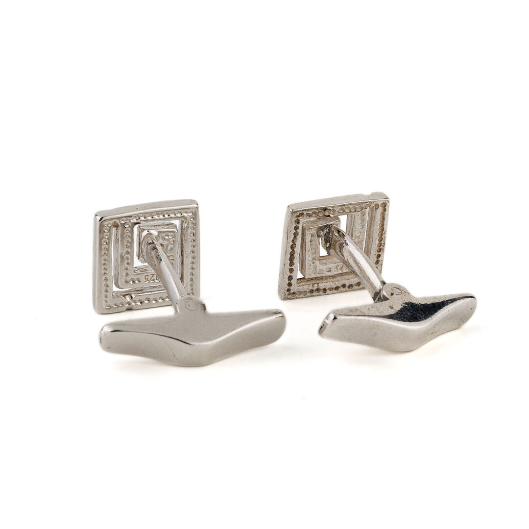 Ένα όμορφο ζευγάρι μανικετόκουμπα, εμπνευσμένο από το αρχαιοελληνικό σύμβολο του μαιάνδρου. Το σχέδιο του Μαιάνδρου είναι ένα διακοσμητικό περίγραμμα κατασκευασμένο από μια συνεχή γραμμή, διαμορφωμένο σε ένα επαναλαμβανόμενο μοτίβο. Το συναντάμε επίσης με την ονομασία “ελληνικό κλειδί”. Από τη μία πλευρά, το όνομα μαίανδρος θυμίζει τη στροφή του ποταμού Μαιάνδρου στη Μικρά Ασία, και από την άλλη, όπως τόνισε ο Karl Kerenyi, «ο μαίανδρος είναι η μορφή ενός λαβύρινθου σε γραμμική μορφή». Λόγω της έλλειψης αρχής και τέλους, γίνεται το σύμβολο της μακράς ζωής και της αιωνιότητας.