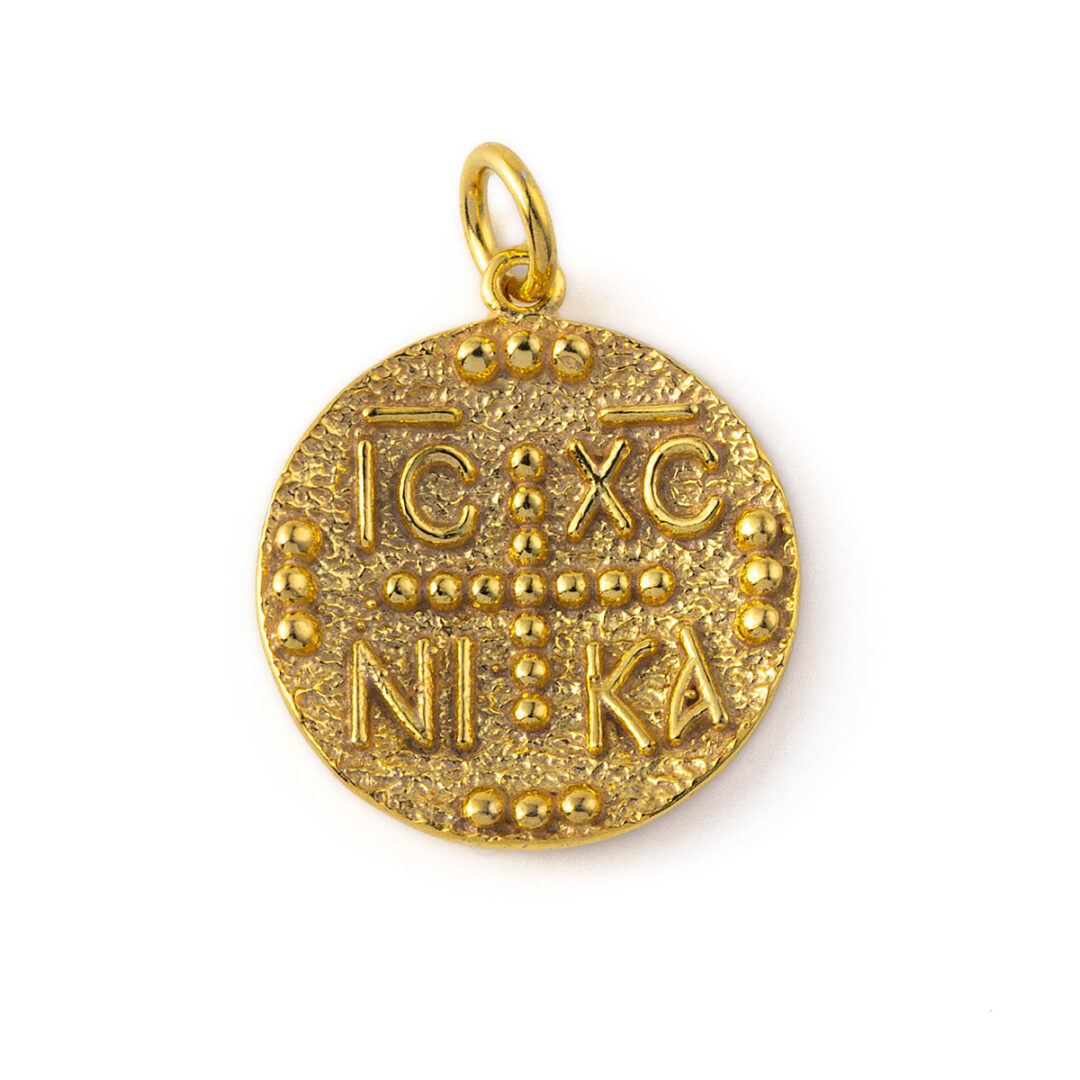 Ένα χειροποιήτο μενταγιόν που απεικονίζει τους Αγίους, Κωσταντίνο και Ελένη, στην μία πλευρά και το σταυρό με το Χριστόγραμμα και τα αρχικά ΙΧ, ΧΣ ΝΙΚΑ ( Ιησούς Χριστός Νικά) στην άλλη.