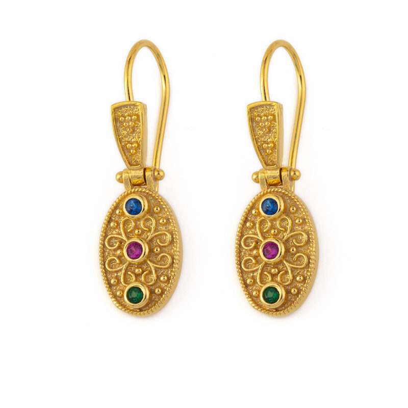 Αναδείξτε τη διαχρονική σας κομψότητα με αυτά τα μοναδικά βυζαντινά σκουλαρίκια ροζέτα, φιλοτεχνημένα στο χέρι από χρυσό 18 καρατίων. Εμπνευσμένα από τη μεγαλοπρέπεια της βυζαντινής τέχνης, συνδυάζουν την ιστορική αισθητική με τη σύγχρονη κομψότητα.