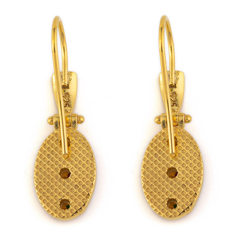 Το μοτίβο της ροζέτας, σύμβολο ομορφιάς και αρμονίας, δεσπόζει στο κέντρο κάθε σκουλαρικιού, προσθέτοντας έναν αέρα αρχοντιάς και φινέτσας. Το φινίρισμα είναι προσεγμένο σε κάθε λεπτομέρεια, αποτυπώνοντας την ποιότητα της παραδοσιακής ελληνικής αργυροχρυσοχοΐας.