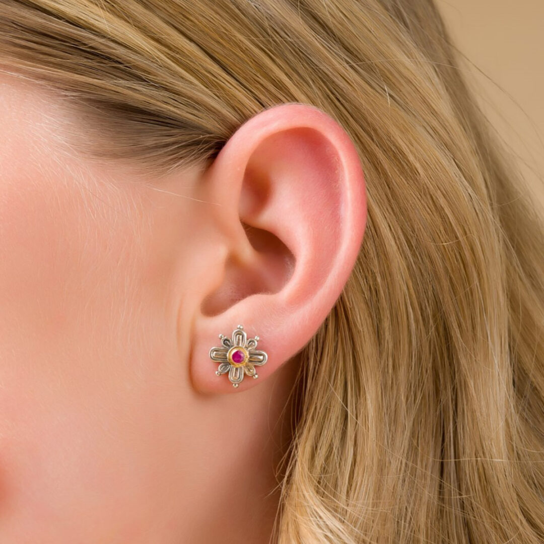 Σκουλαρίκια Σταυρός Από Ασήμι 925 & Χρυσό 18Κ με Ρουμπίνια