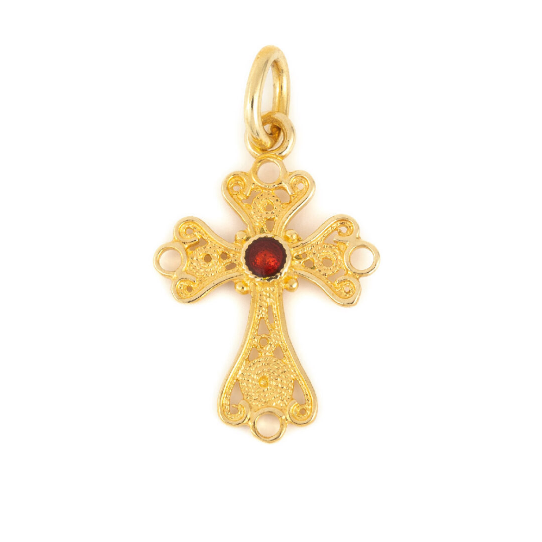 Βυζαντινός σταυρός διακοσμημένος με λεπτό φιλιγκράν και κόκκινο σμάλτο. Η διακόσμηση και το σχήμα αυτού του σταυρού δείχνουν την επιρροή της βυζαντινής τέχνης.