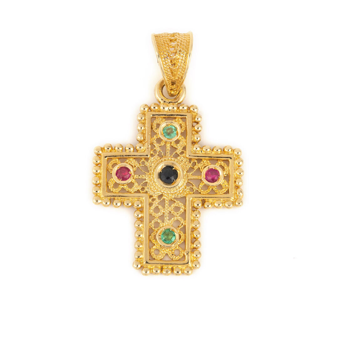 Βυζαντινός Χρυσός Σταυρός Φιλιγκράν 18Κ με Ρουμπίνια Σμαράγδια και Ζαφείρια
