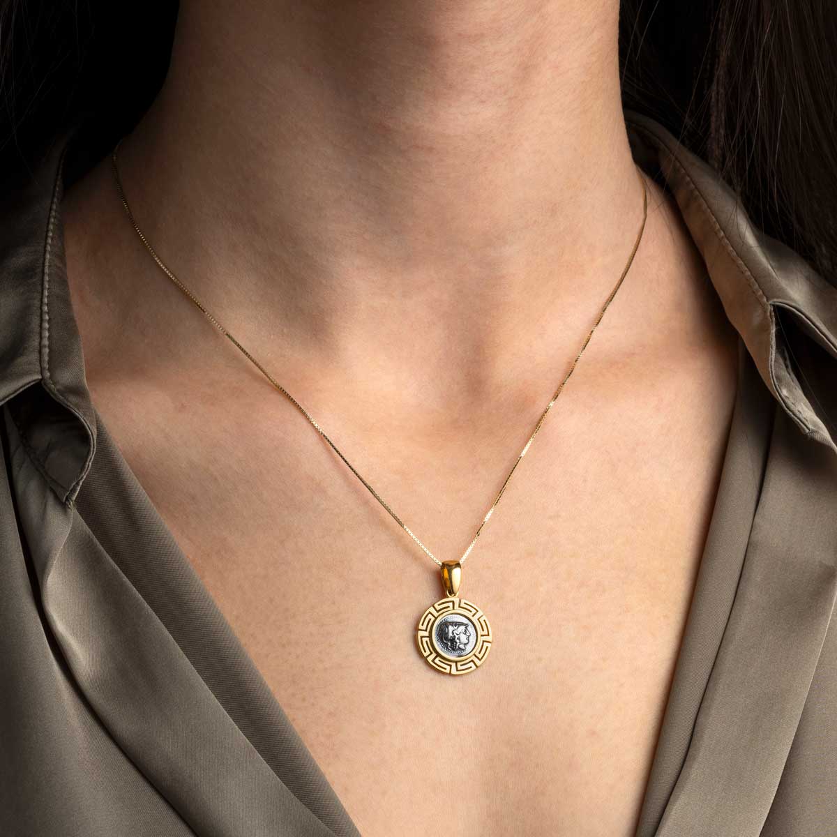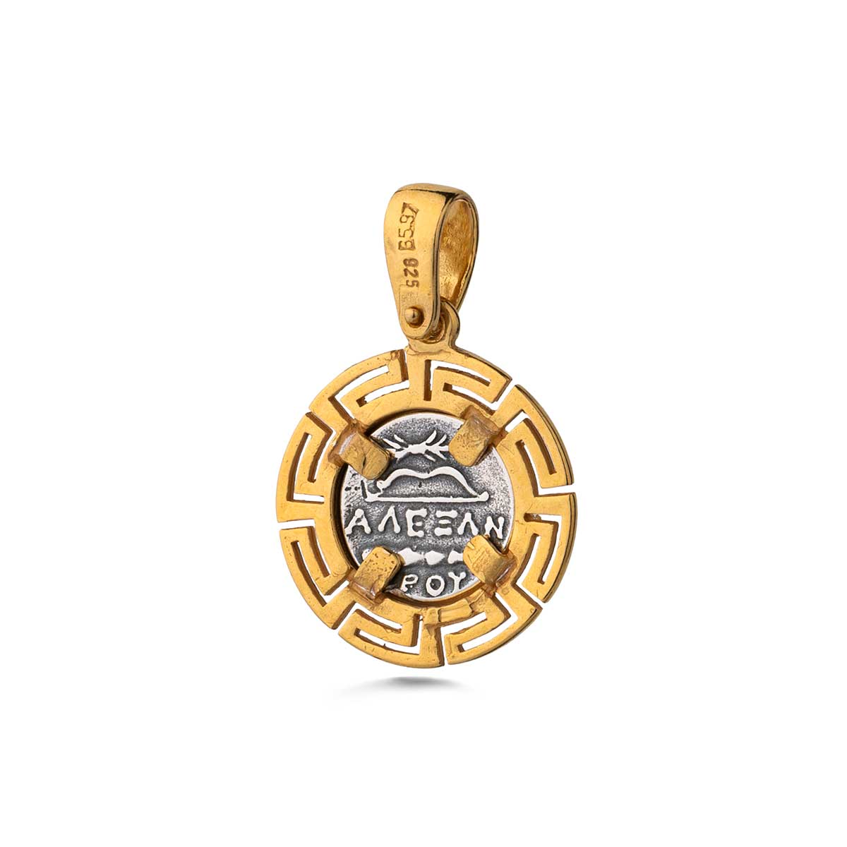 This Ancient Greek coin represents Athena Chalinitis on the front side and the inscription “ΑΛΕΞΑΝΔΡΟΥ” on the backside.