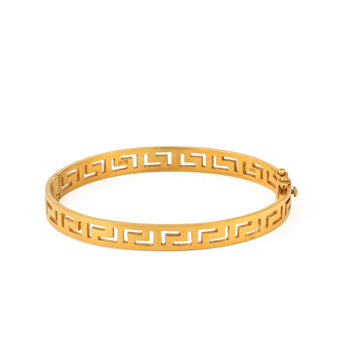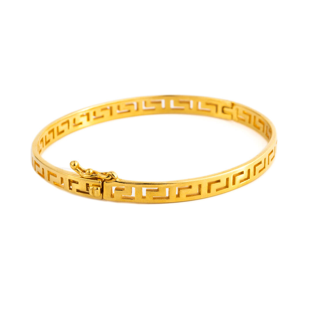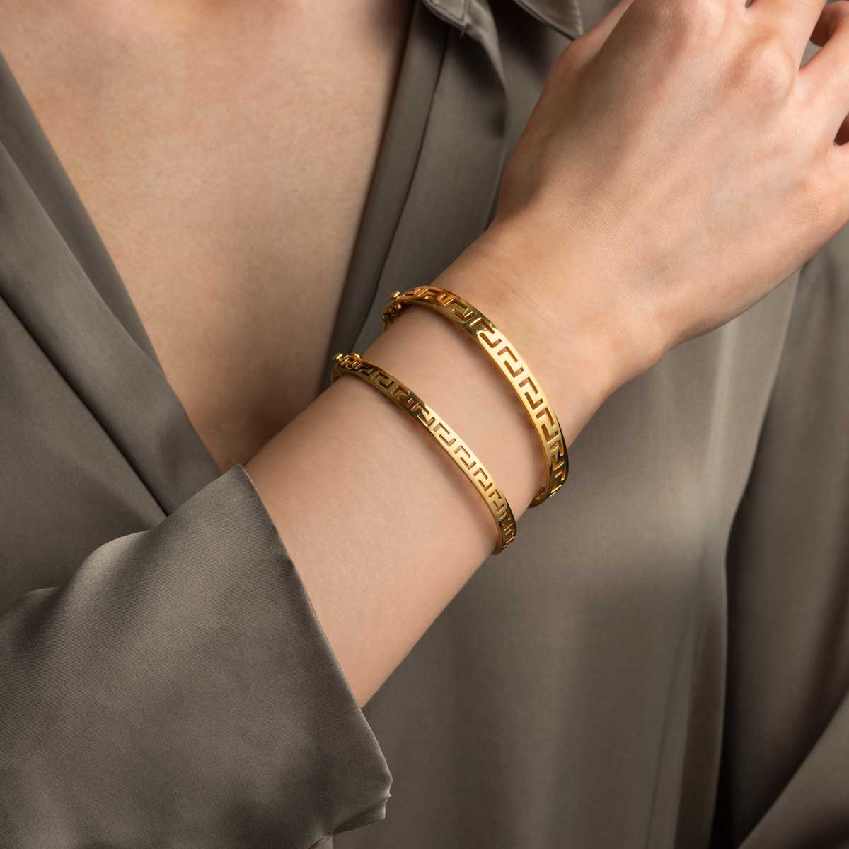 Beautiful and elegant bracelet inspired by the ancient greek meander (meandros) symbol. Meander design is a decorative border constructed from a continuous line, shaped into a repeated motif. Such a design is also called the Greek fret or Greek key design, although these are modern designations. One the one hand, the name “meander” recalls the twisting and turning path of the Meander River in Asia Minor, and on the other hand, as Karl Kerenyi pointed out, “the meander is the figure of a labyrinth in linear form” the meaning is that these is no beginning and to end end in some cases so it become the symbol of long life and eternity.