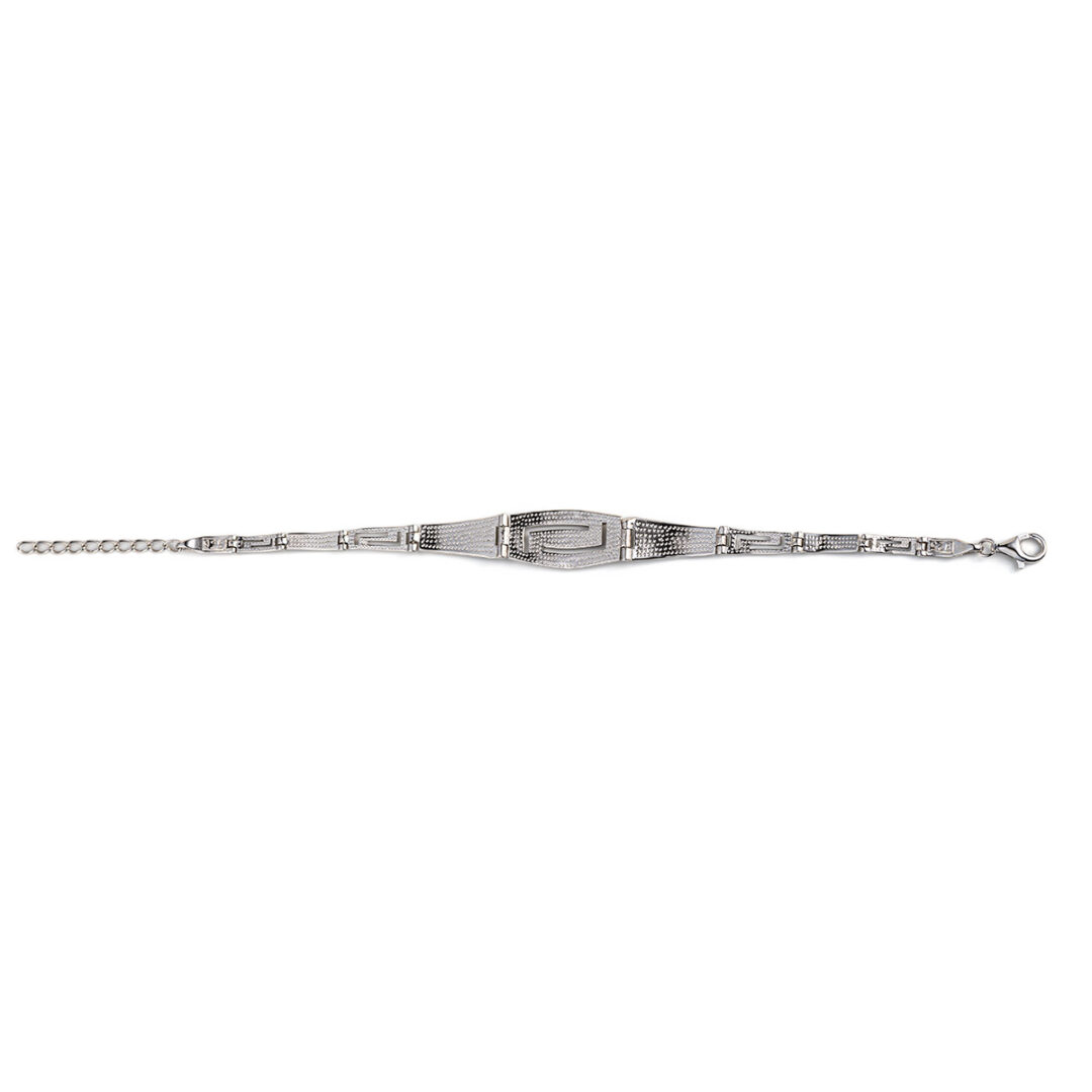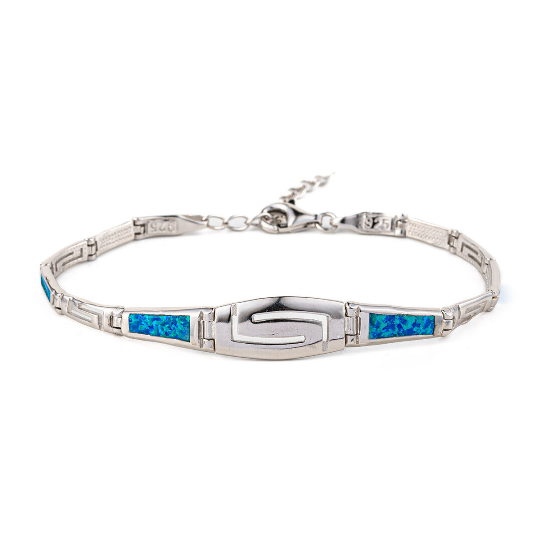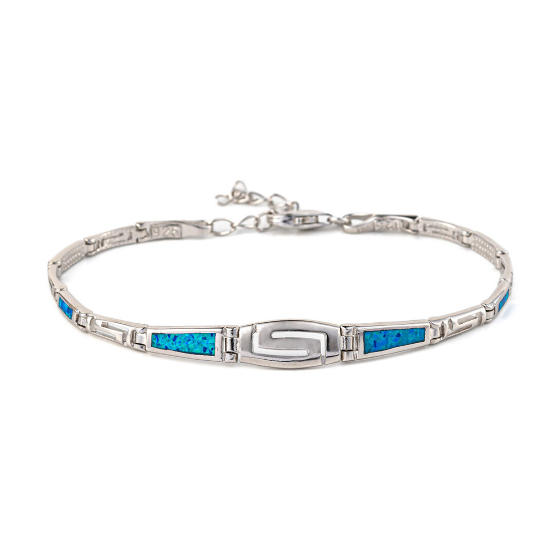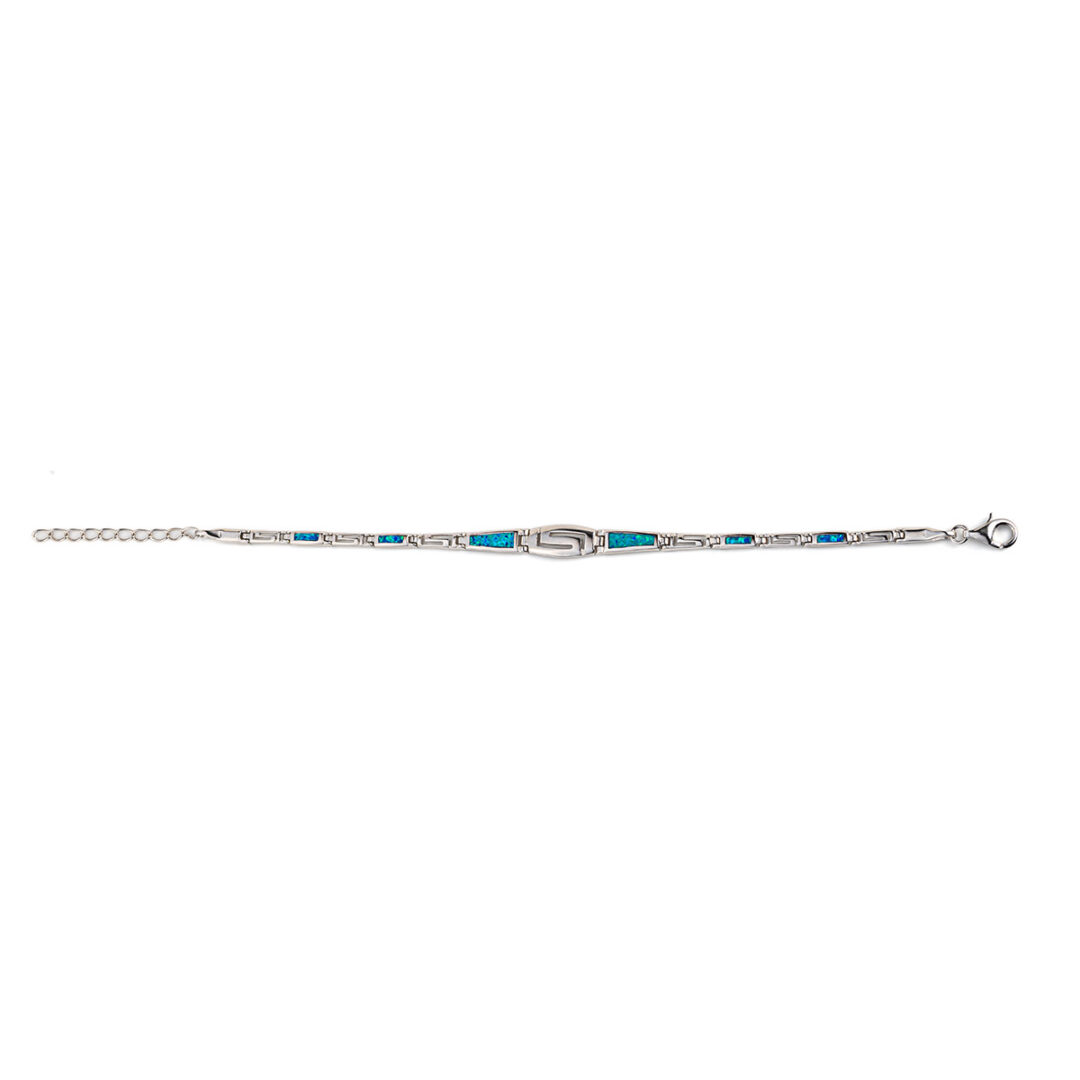 A sterling silver bracelet featuring Meander or Greek Key links. There are four (large size) or six links (small & medium size) with blue opal.