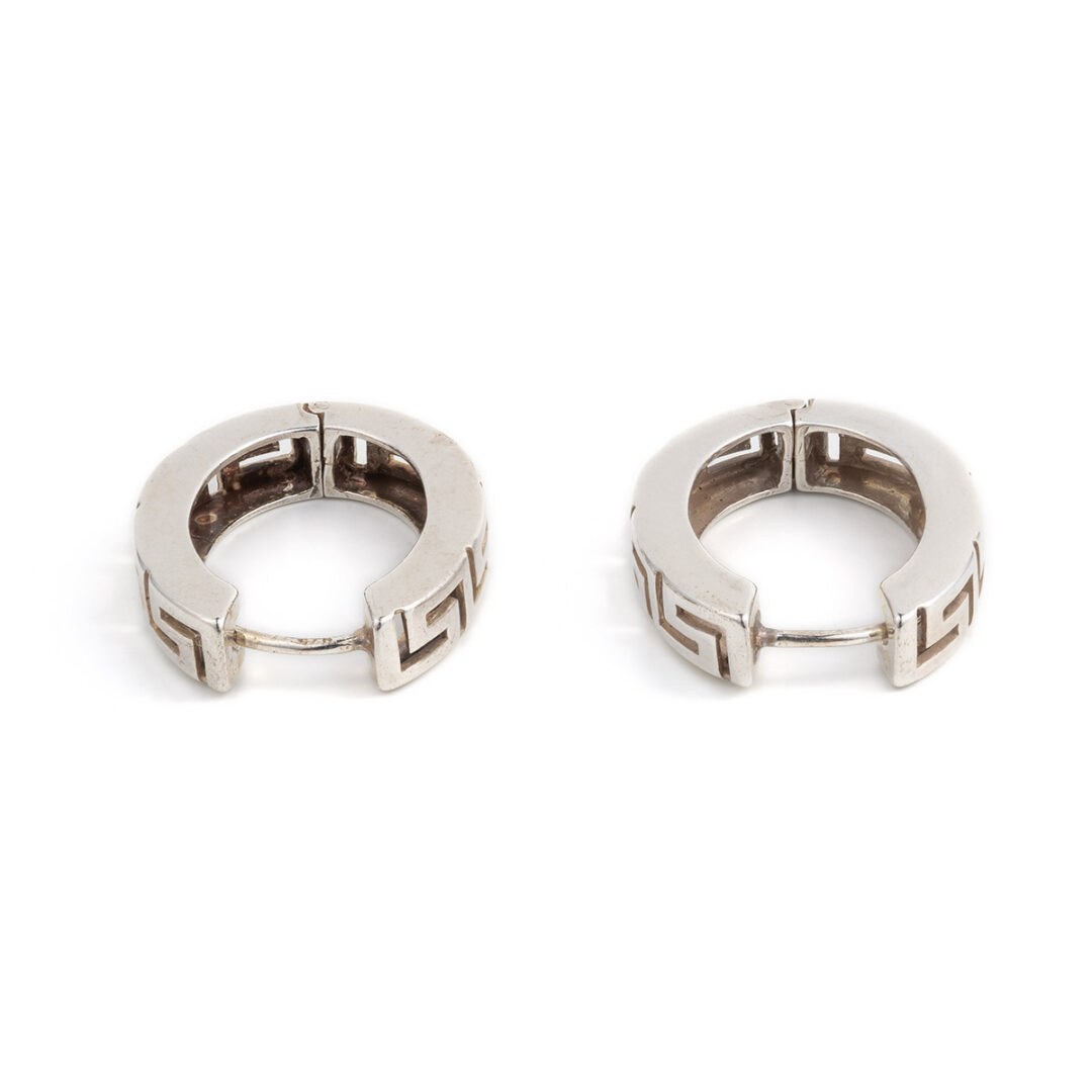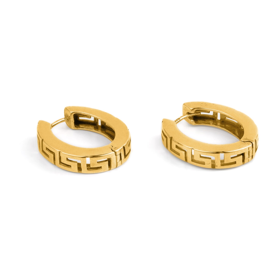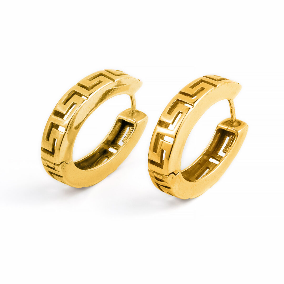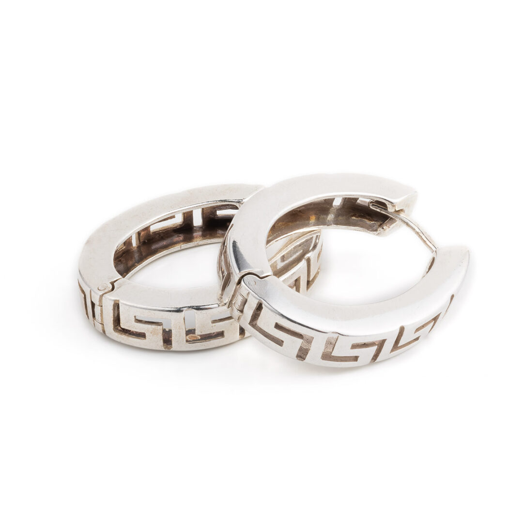 Earrings with Greek Key – Meander design. Meandros design is a decorative border constructed from a continuous line, shaped into a repeated motif. Such a design is also called the Greek fret or Greek key design, although these are modern designations. One the one hand, the name “meander” recalls the twisting and turning path of the Meander River in Asia Minor, and on the other hand, as Karl Kerenyi pointed out, “the meander is the figure of a labyrinth in linear form” the meaning is that these is no beginning and to end in some cases so it become the symbol of long life and eternity.