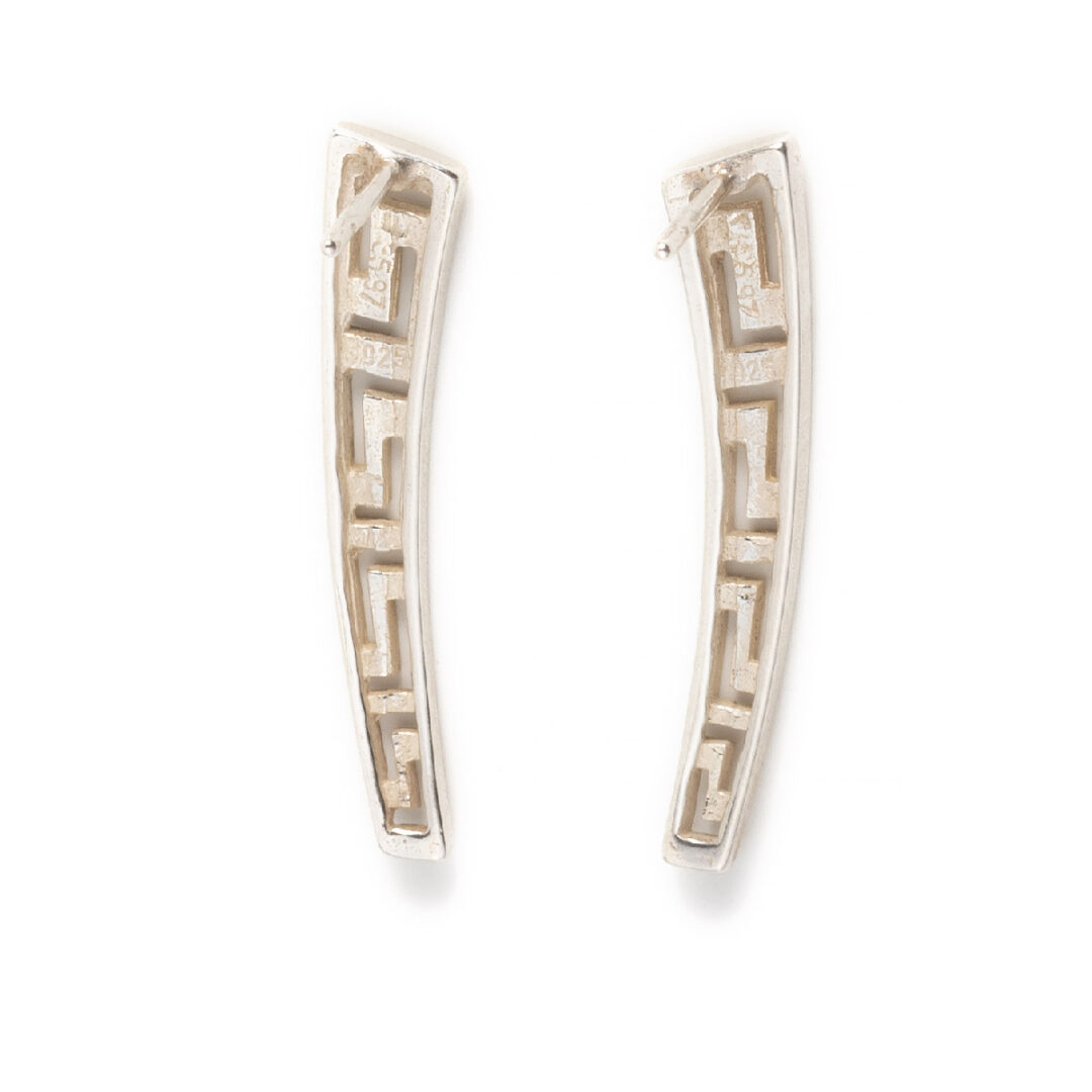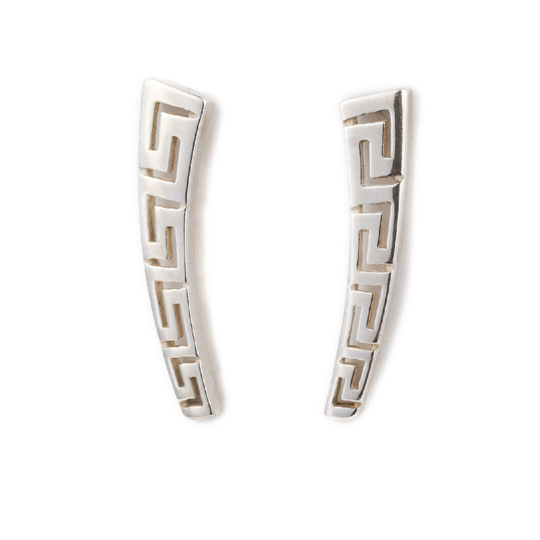 Stud Earrings with Meander design. Meandros design is a decorative border constructed from a continuous line, shaped into a repeated motif. Such a design is also called the Greek fret or Greek key design, although these are modern designations. One the one hand, the name “meander” recalls the twisting and turning path of the Meander River in Asia Minor, and on the other hand, as Karl Kerenyi pointed out, “the meander is the figure of a labyrinth in linear form” the meaning is that these is no beginning and to end in some cases so it become the symbol of long life and eternity.