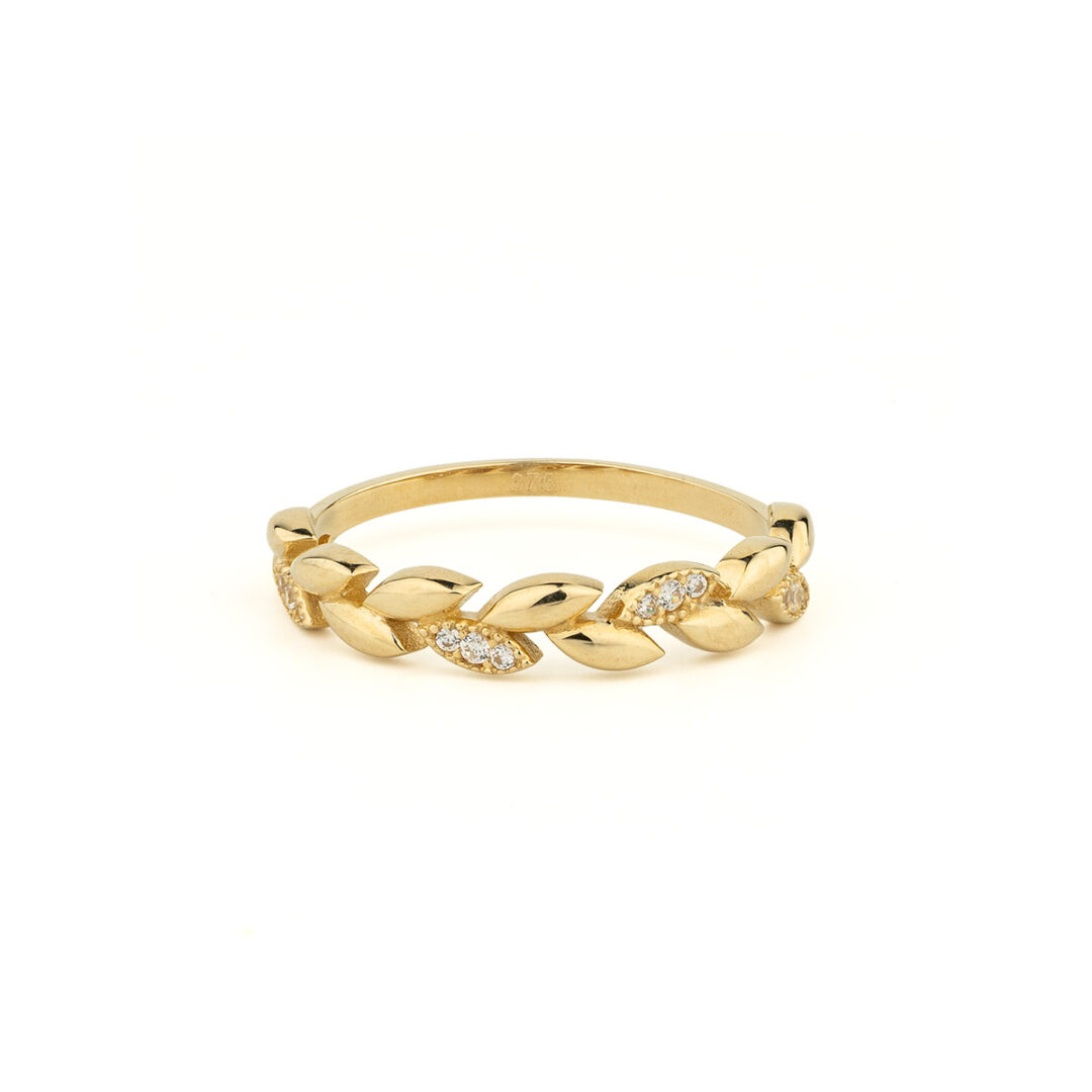 Olive Branch Ring with Zircon – 14K Yellow Gold Greek Symbol Jewelry