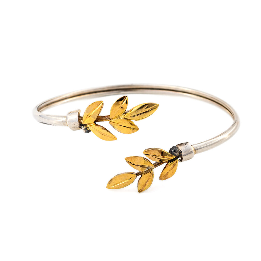 This is a silver bracelet with 14k gold olive leaves. The olive wreath also known as kotinos was the prize for the winner at the ancient Olympic Games. It was an olive branch, of the wild- olive tree that grew at Olympia,intertwined to form a circle or a horse-shoe. According to Pausanias it was introduced by Heracles as a prize for the running race winner to honour his father Zeus. In the ancient Olympic Games there were no gold, silver, or bronze medals. There was only one winner per event, crowned with an olive wreath made of wild-olive leaves from a sacred tree near the temple of Zeus at Olympia. Olive wreaths were given out during the 2004 Summer Olympics in Athens in honor of the ancient tradition, because the games were being held in Greece.