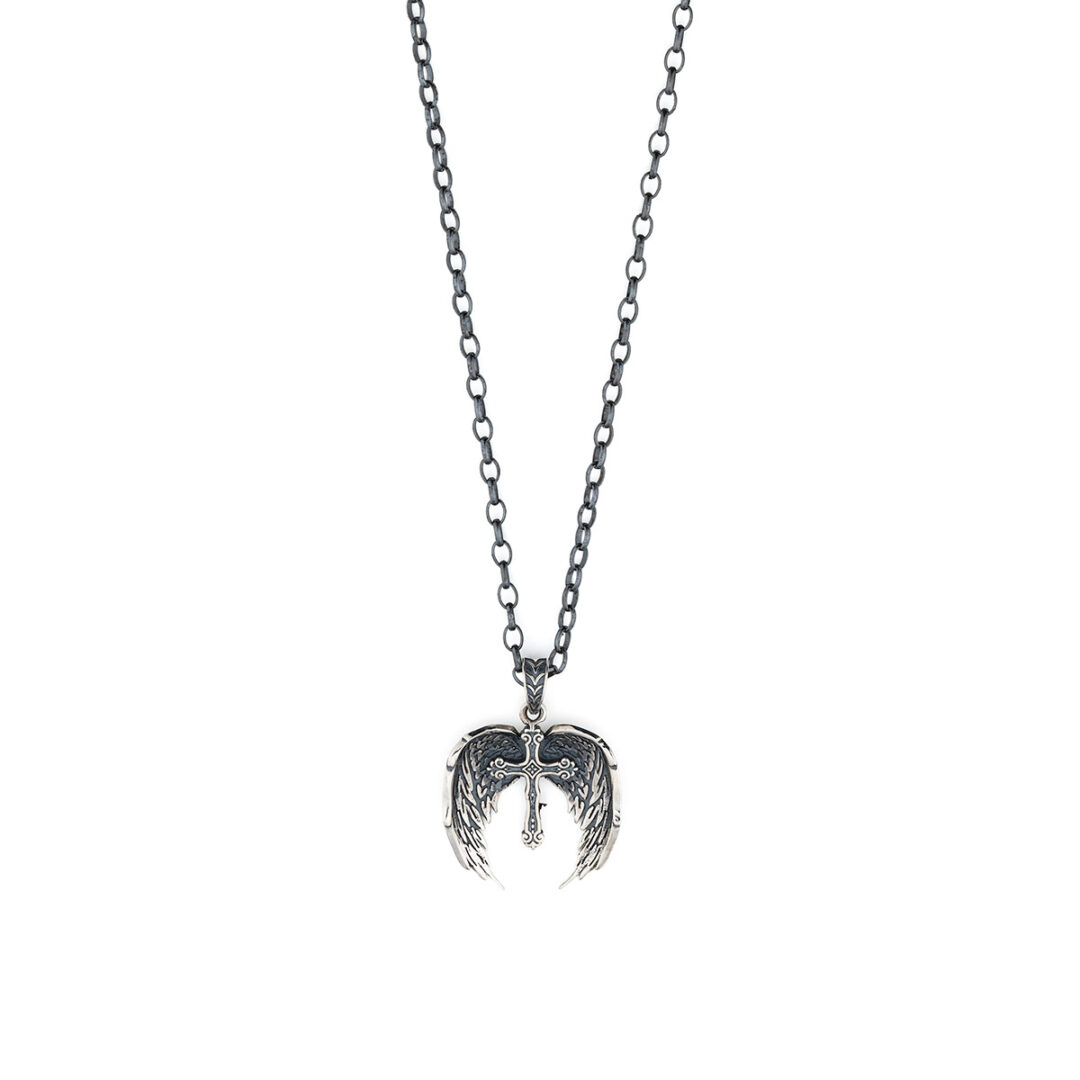 Minimal unisex feather pendant with cross and chain, for men and women, featuring an elegant design and a polished finish made of oxidized 925 sterling silver to add a sparkling touch to your everyday look.