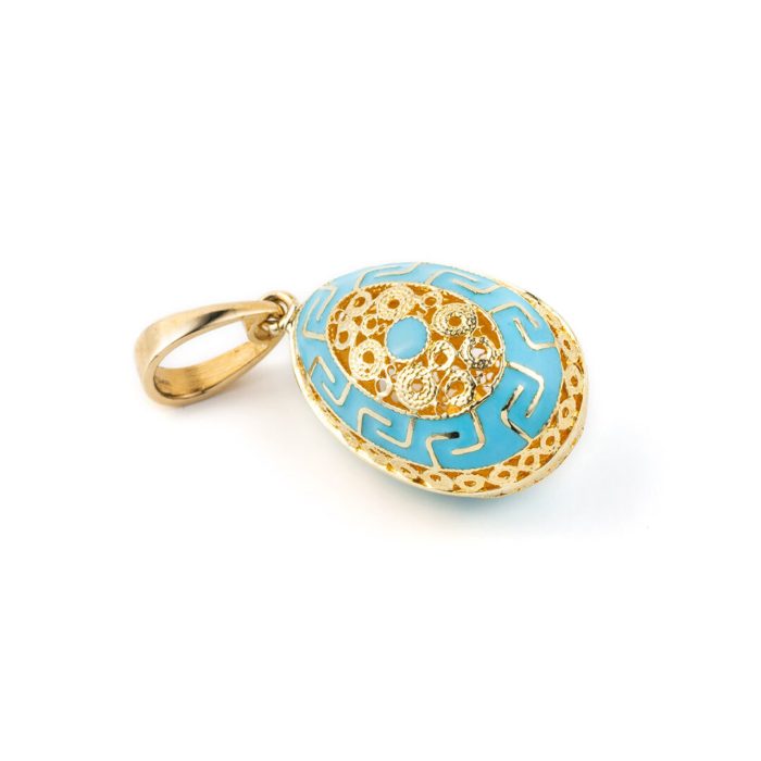 14k Gold Meander Filigree Egg Pendant with Turquoise Enamel