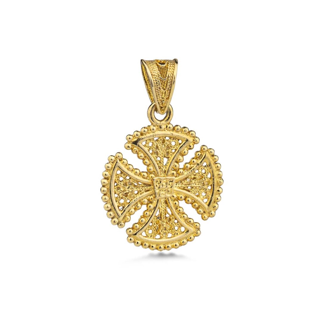 Discover the beauty of timeless craftsmanship with this stunning 18k gold Byzantine filigree cross pendant. This handmade piece draws inspiration from the intricate patterns of traditional Byzantine jewelry. The front showcases delicate filigree detailing, while the reverse is polished and unadorned for a classic finish.