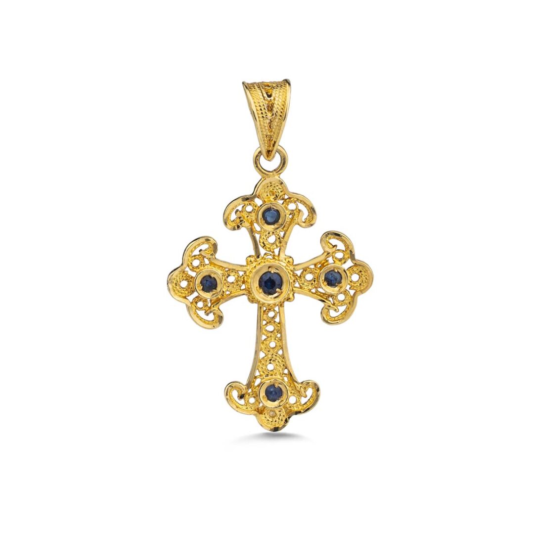 18k Gold Filigree Byzantine Cross With Sapphire