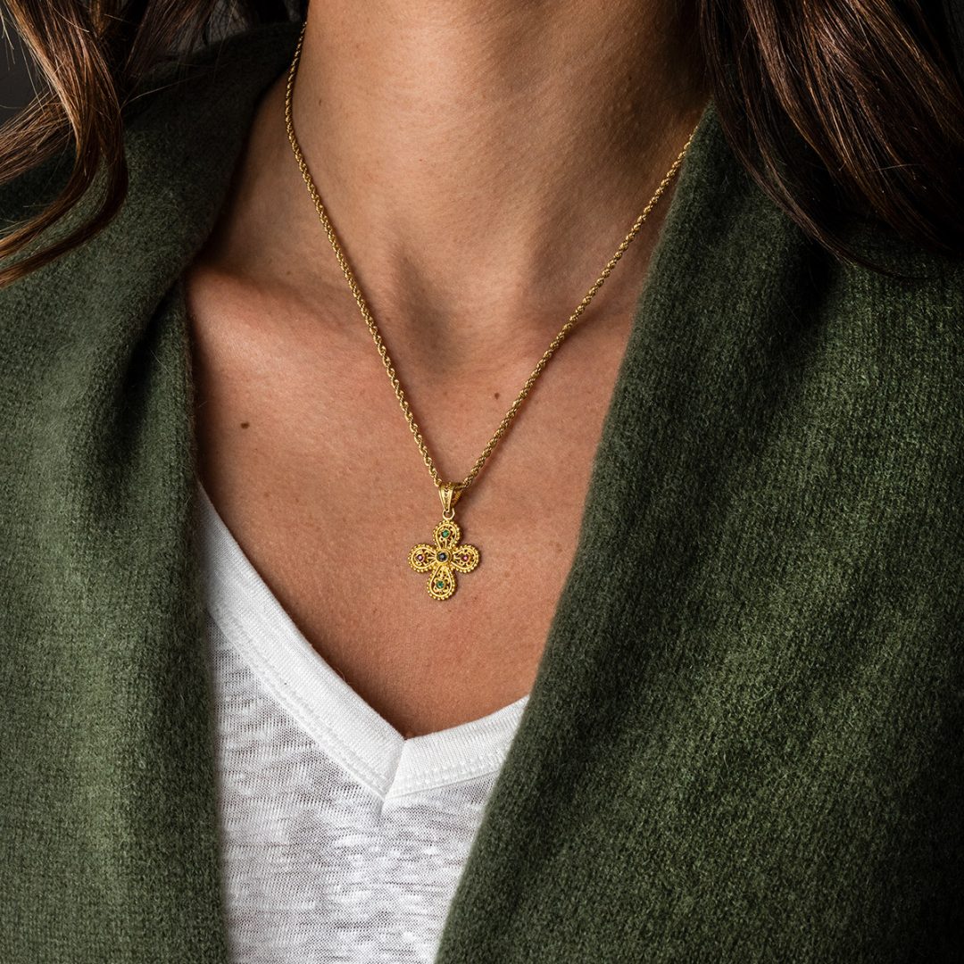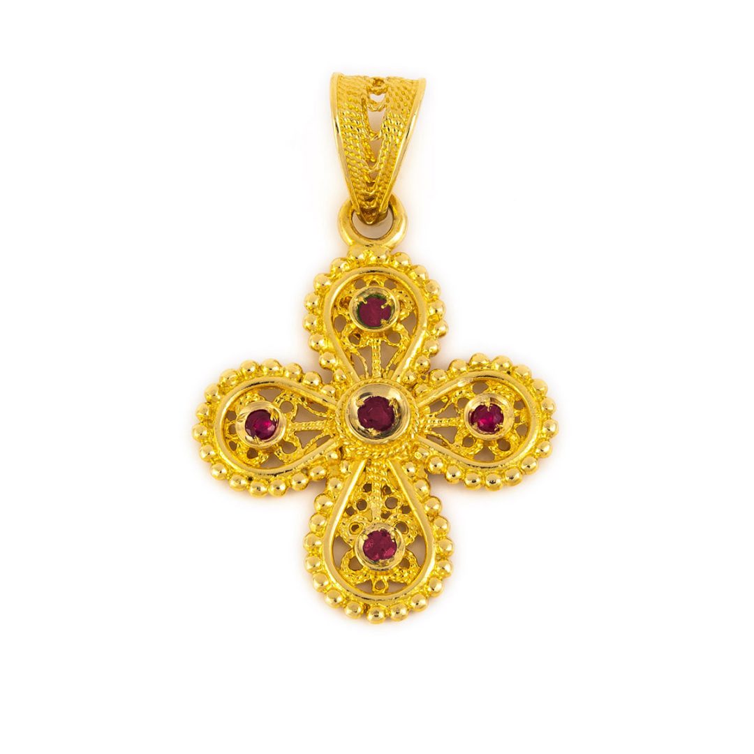 18K Gold Filigree Cross with rubies, emeralds and sapphires