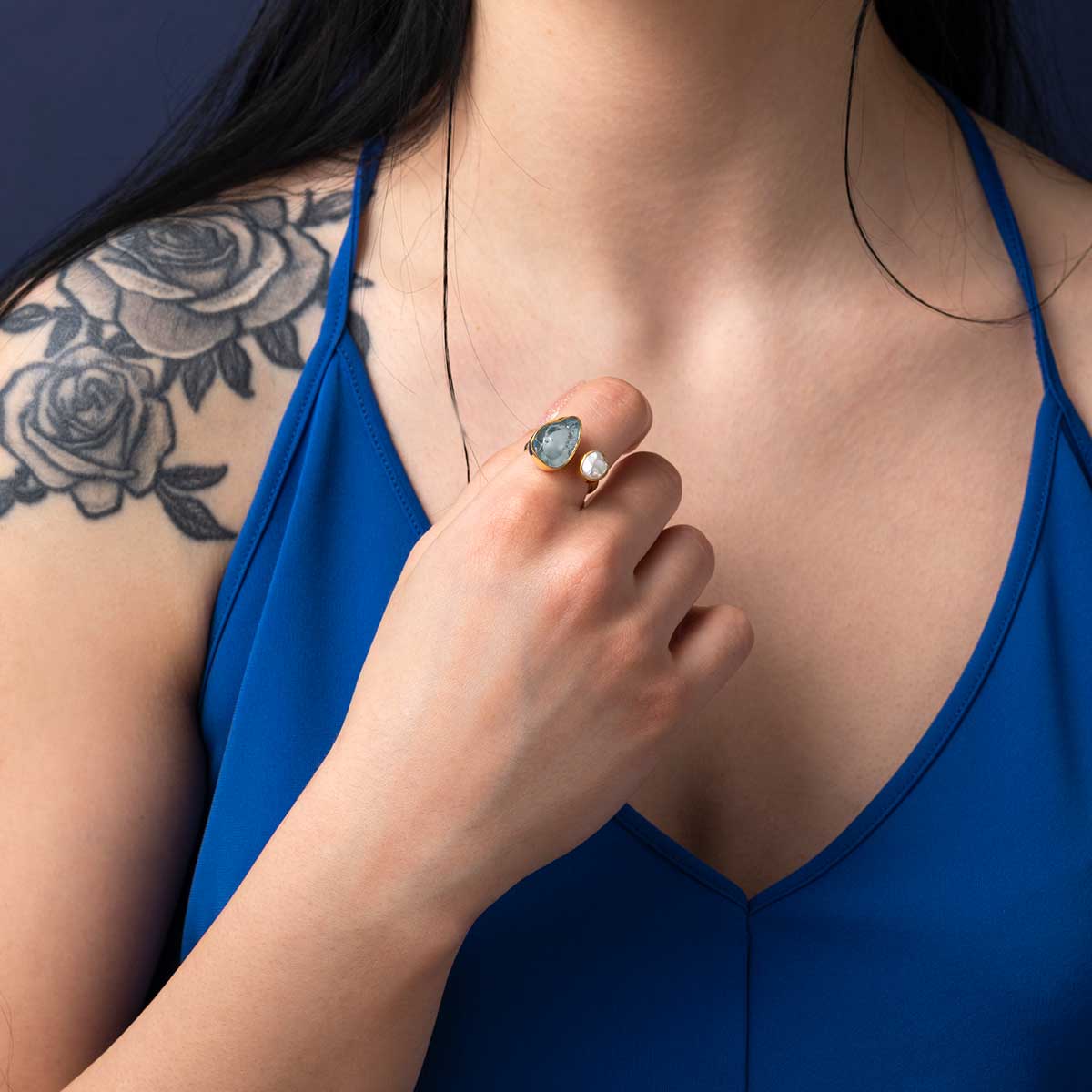 Aqua Marine and Pearl Open Ring – 925 Sterling Silver and Gold Plated