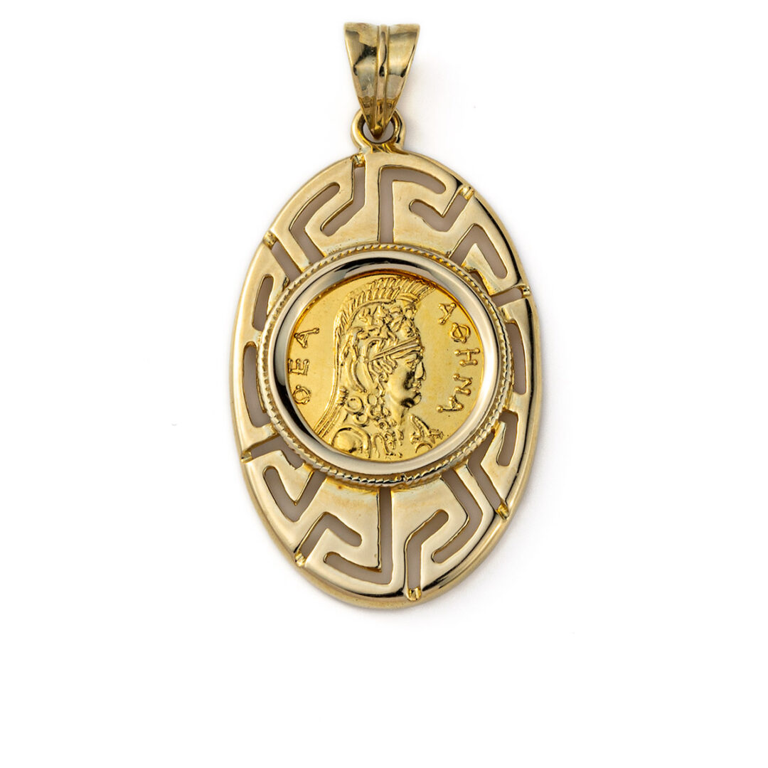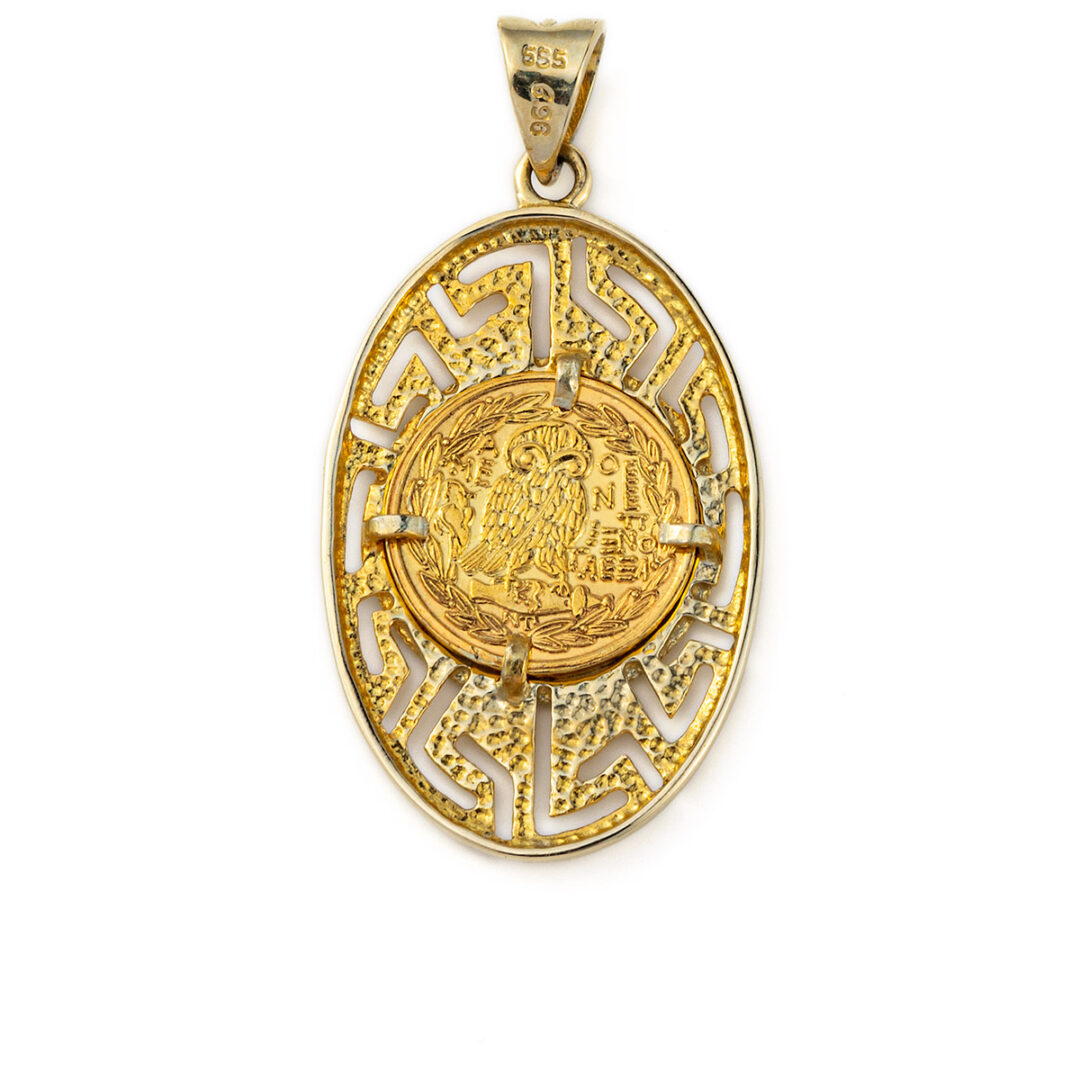 Athena and Owl Pendant with Greek Key – 14K Solid Gold