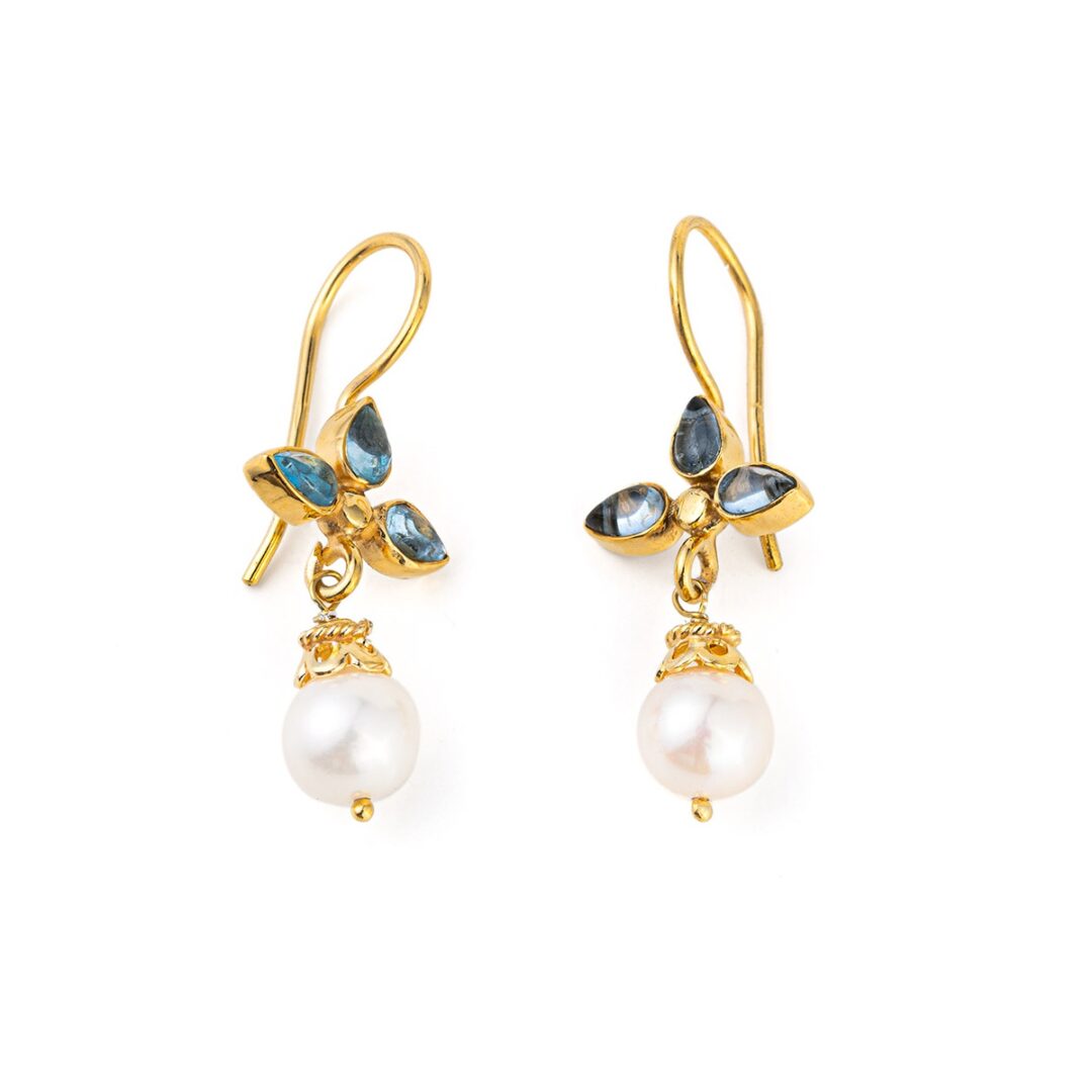 Blue Topaz n Pearl Flower Earrings – 925 Sterling Silver and Gold Plated