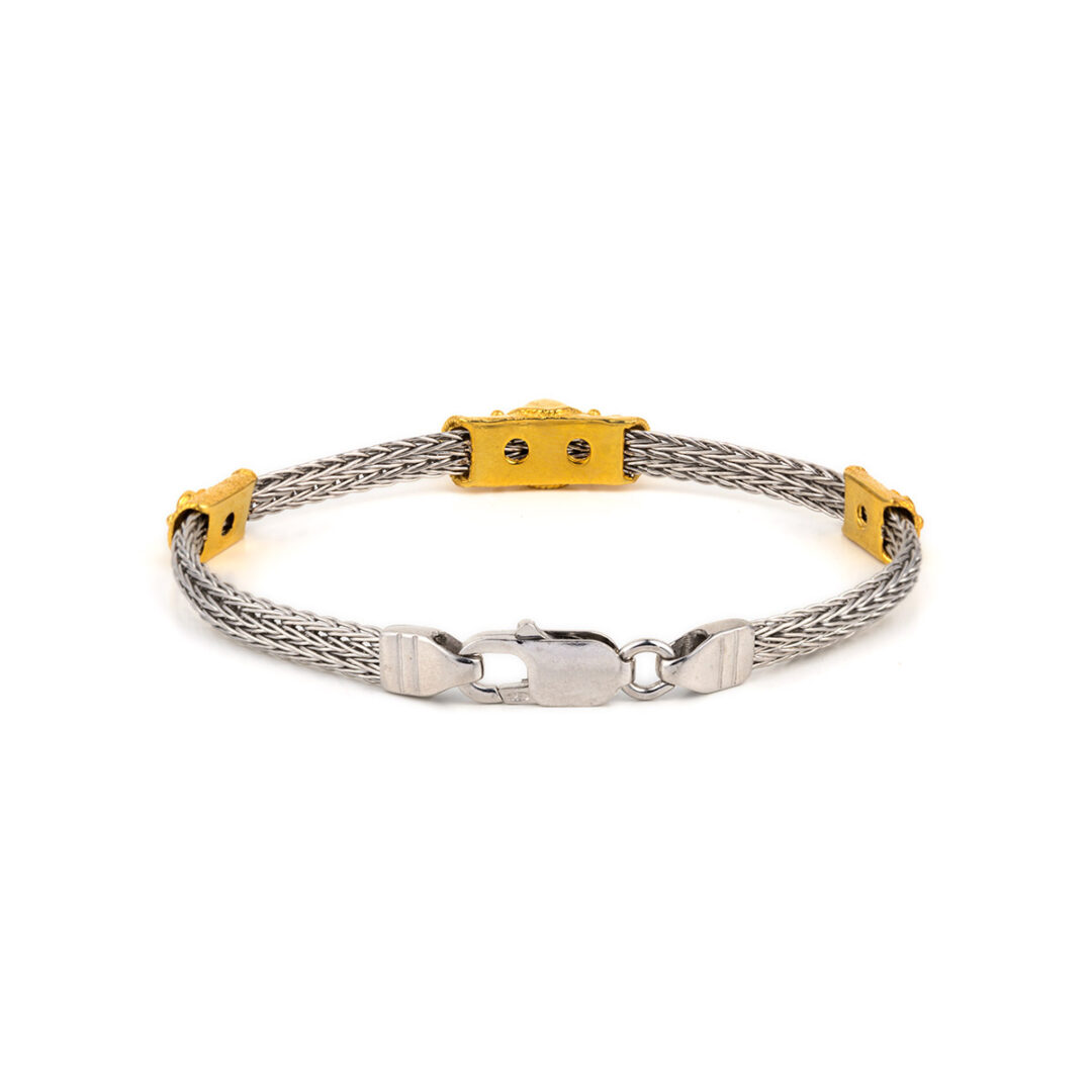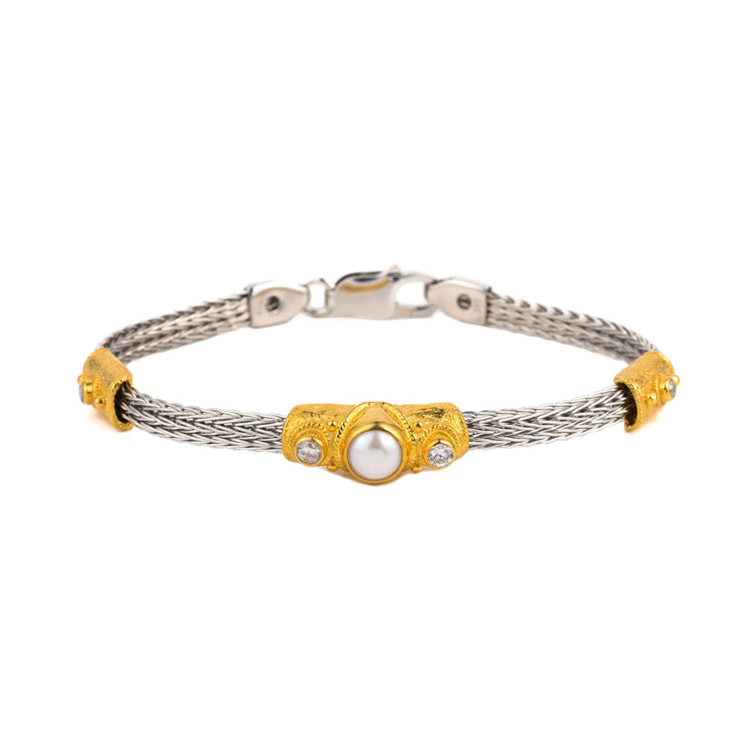 This bracelet is inspired by the Byzantine Historical period respecting Greek traditional art. A unique and elegant bracelet made in 925⁰ sterling silver and gold plated, decorated with pearl and Swarovski crystals.