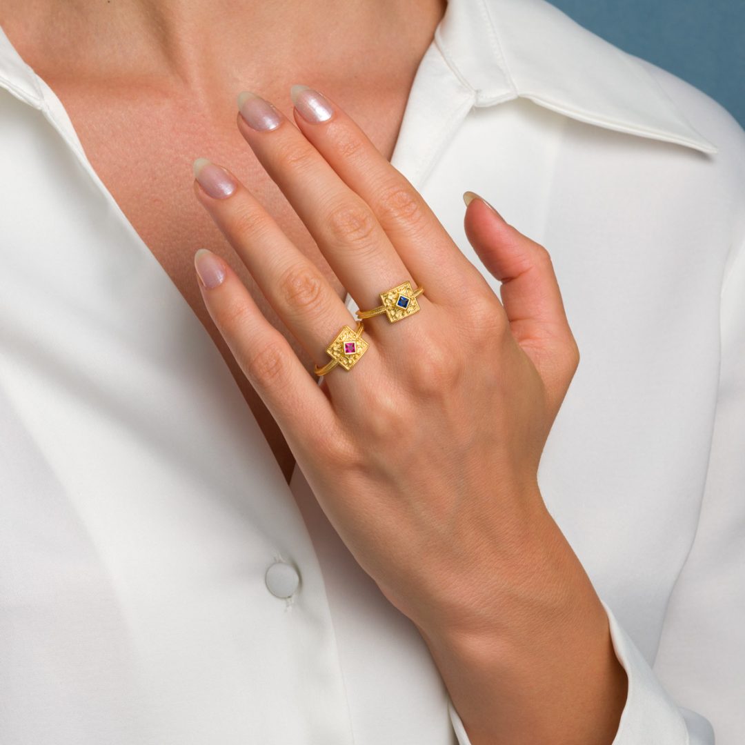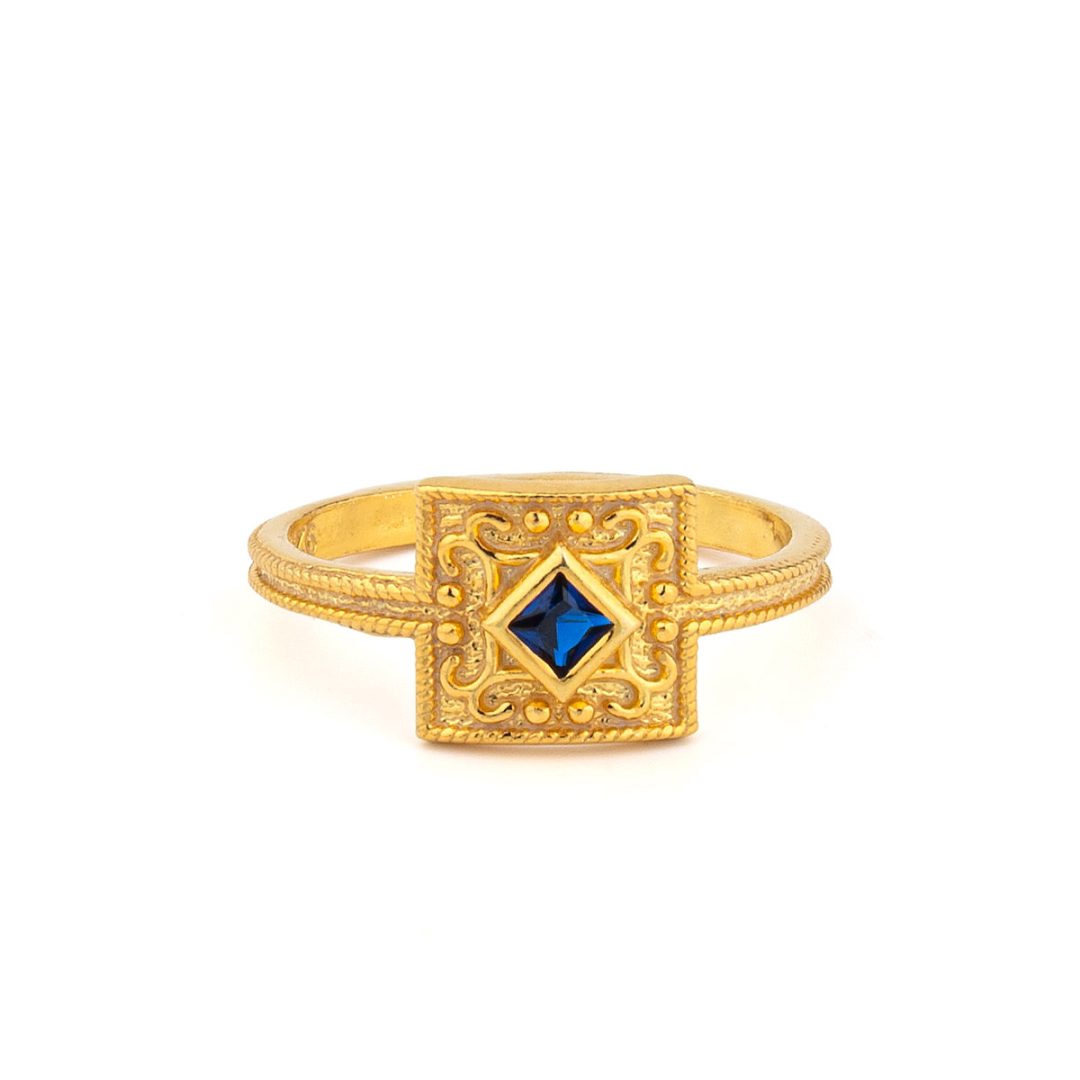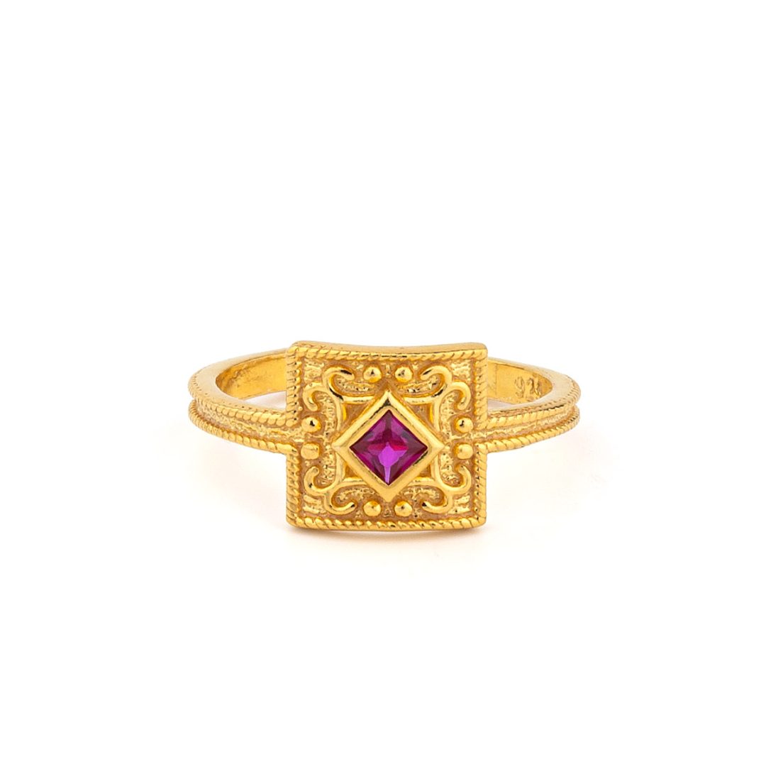 Byzantine Square Ring in 925 Sterling Silver Gold Plated with Zircon