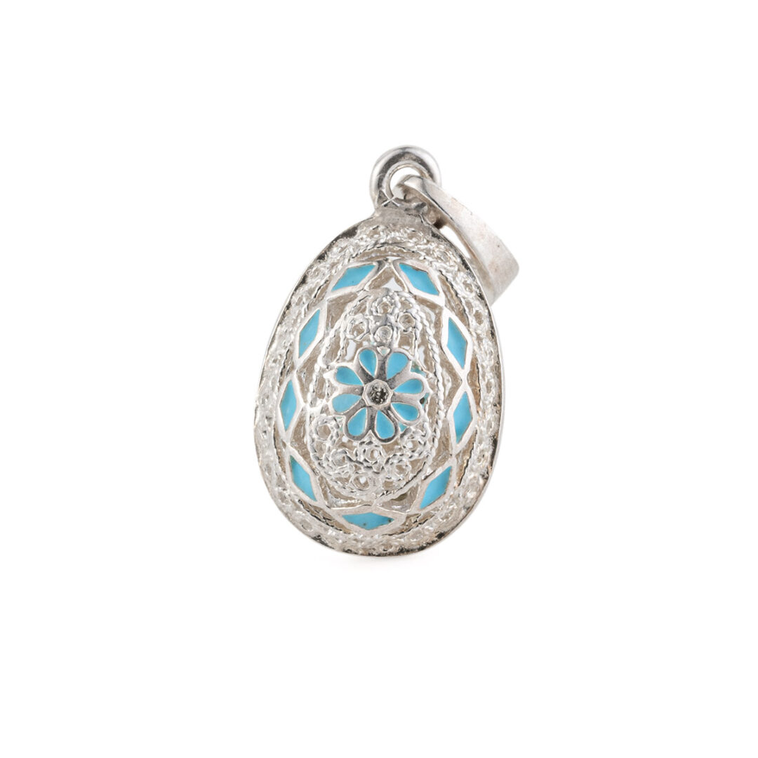 The pendant is embellished with a fine filigree and enamel in Faberge style.