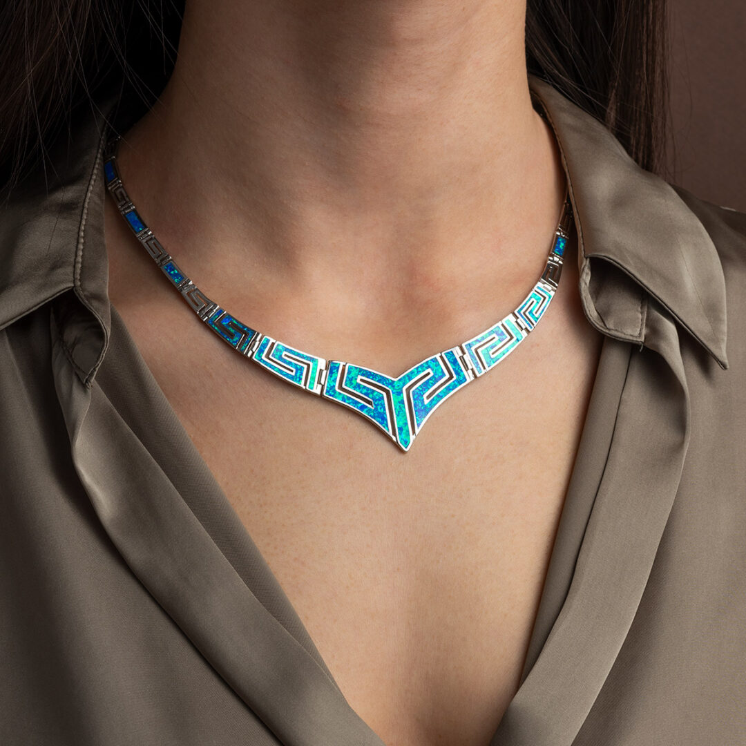Greek Key Necklace with Blue Opal – Sterling Silver