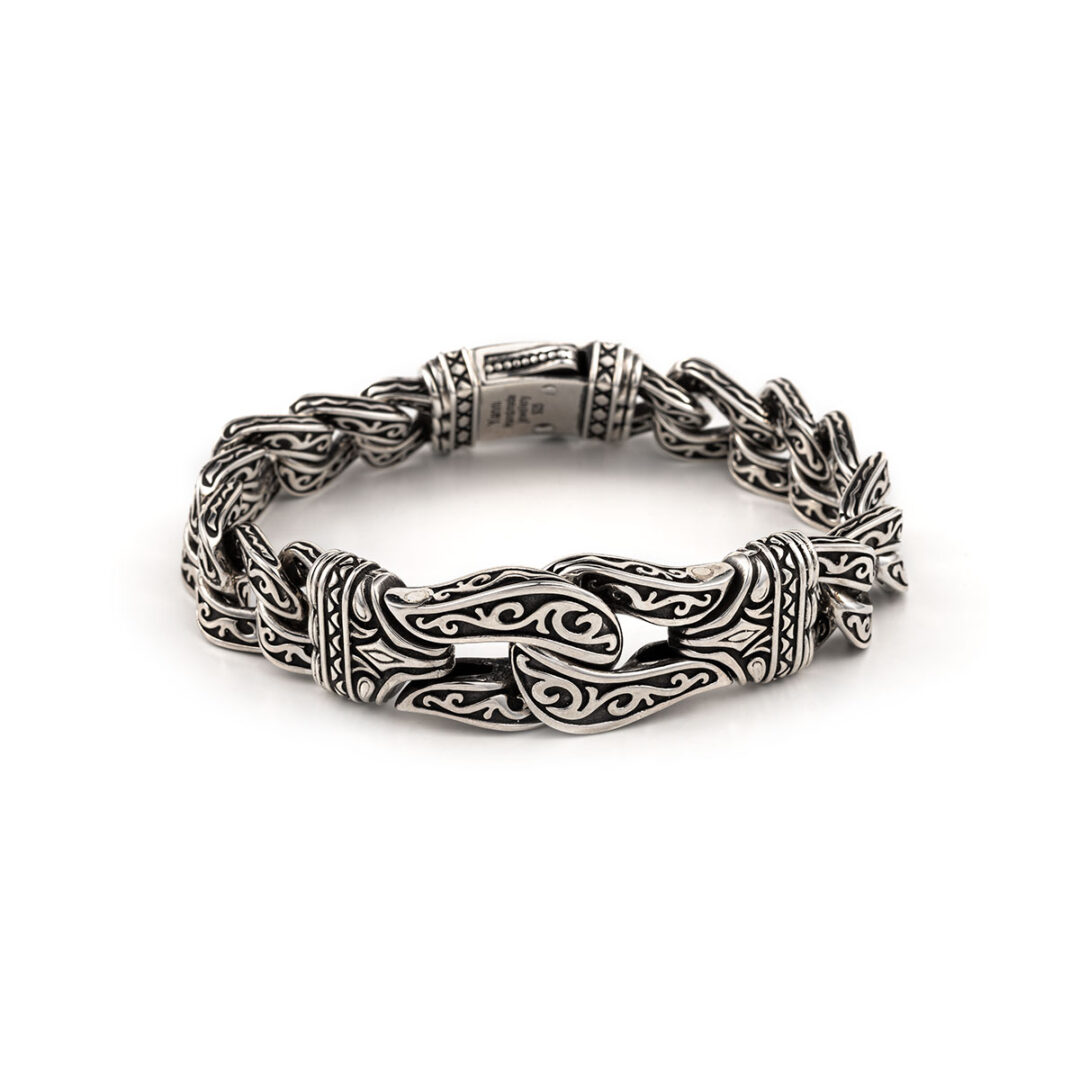 This knot made with two entwined ropes is considered to represent the legendary fertility of God Hercules. This unique chain bracelet is crafted with sterling silver, each link in this bracelet has elaborate engravings, which run along the entire bracelet.