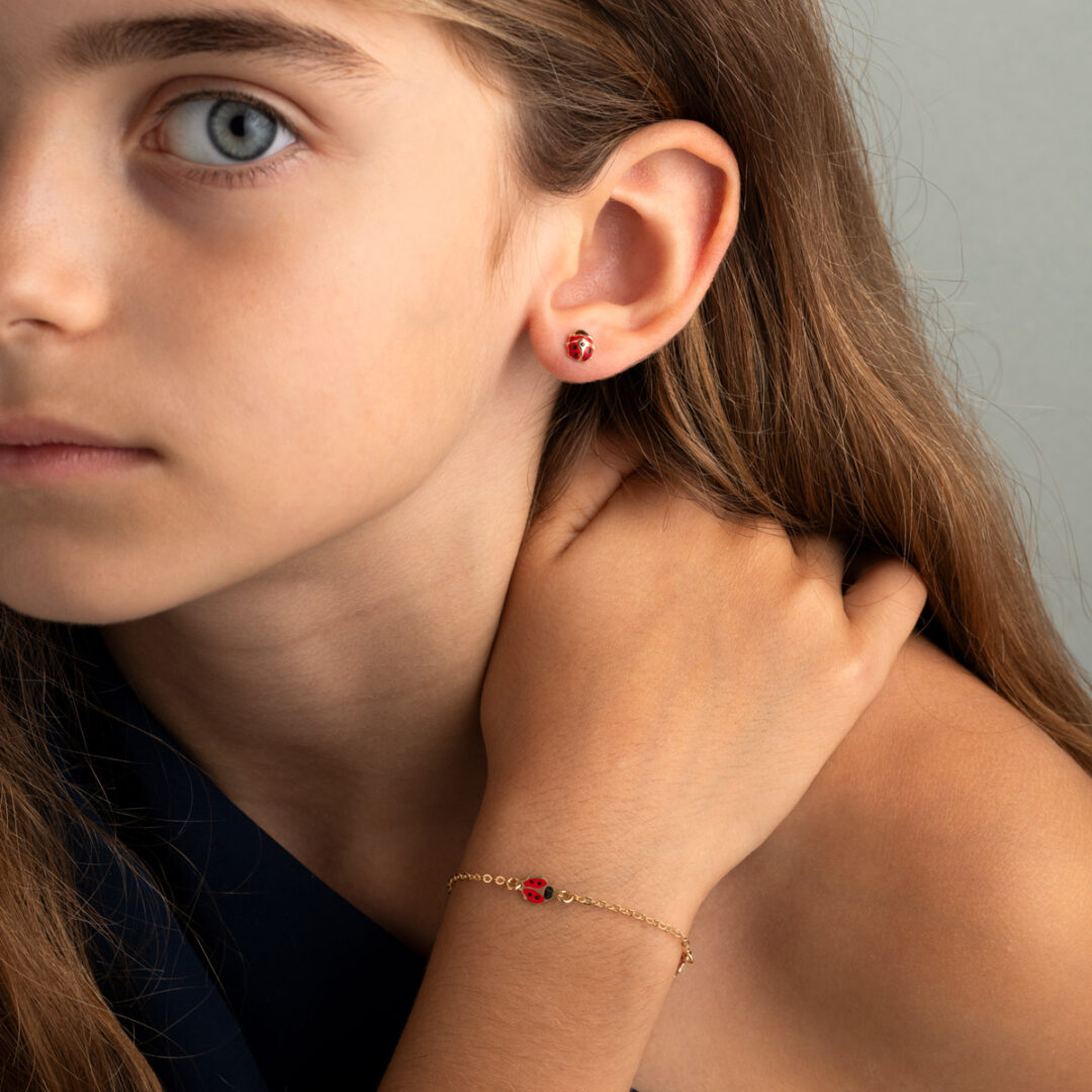 Adorable 9K gold stud earrings in ladybug shape decorated with red and black enamel for kids, a sweet jewelry gift for little ones.