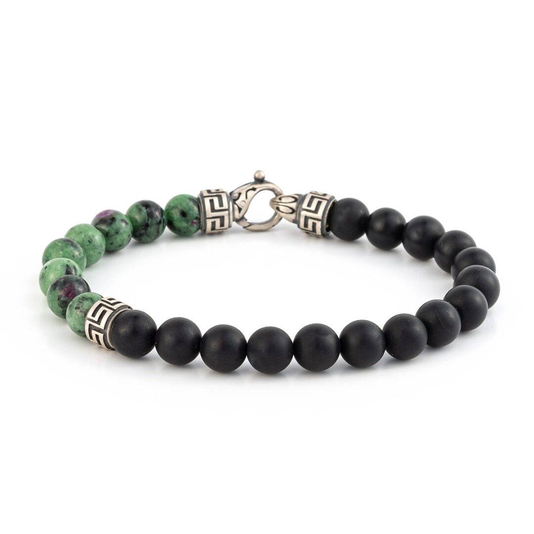Sterling Silver bracelet with meander motif, black onyx and rubyzoesite beads.