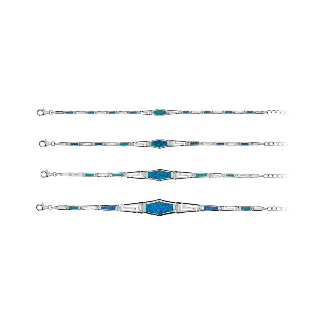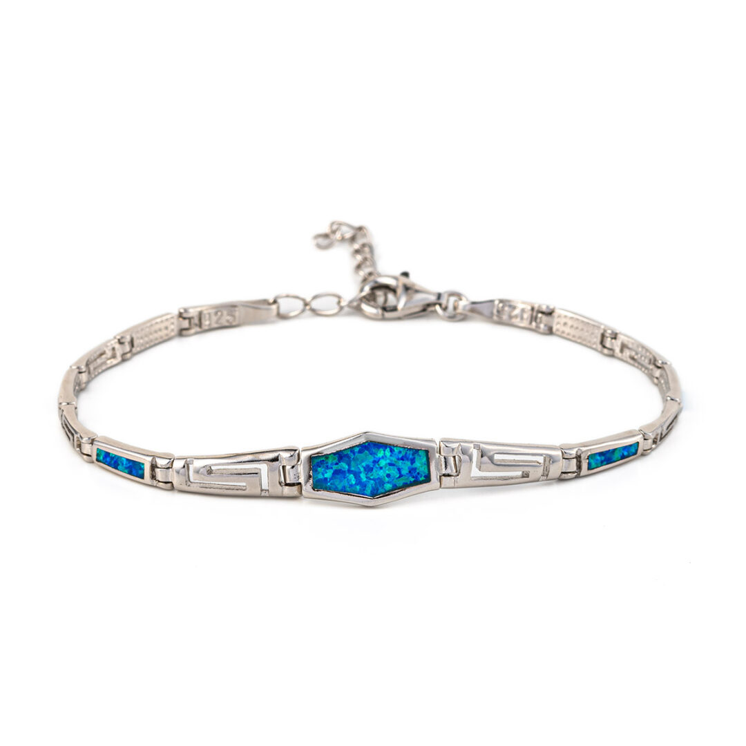 A sterling silver bracelet featuring traditional Greek Key or Meander links with bright blue opal stones.