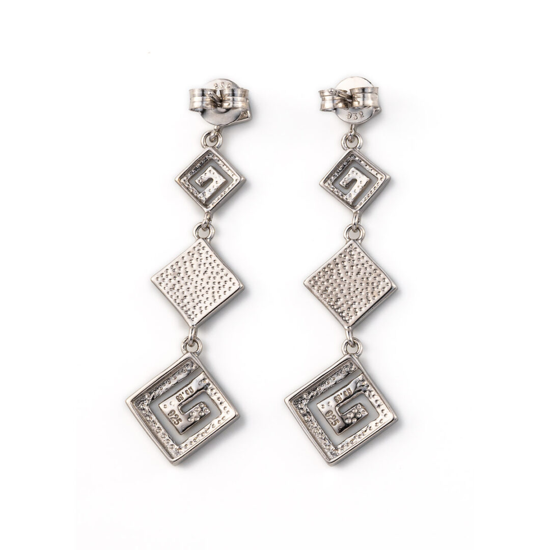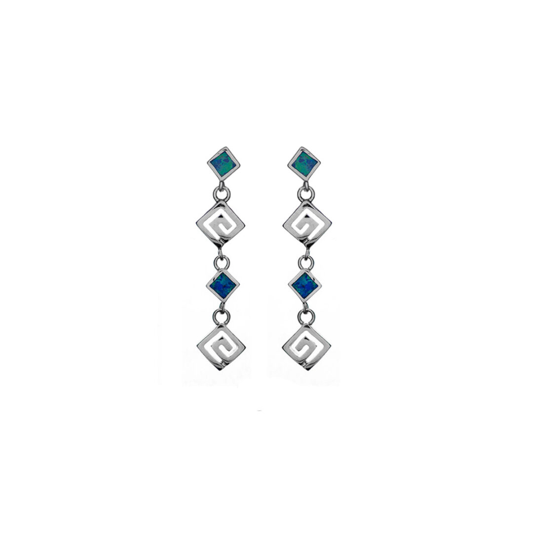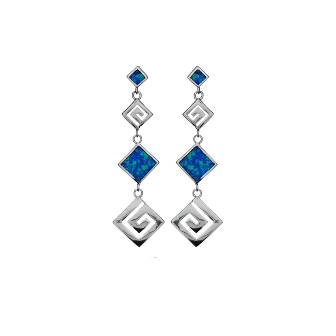 925 fine silver dangle earrings featuring a Meander or Greek Key pattern with blue opal gemstones.