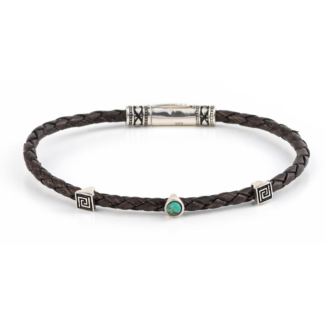Sterling silver bracelet with greek key motif, black genuine leather and turquoise stone.