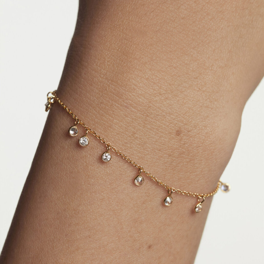 The Bliss Bracelet is set with flashy round cut zirconia stone pendants on a 925 sterling silver cable chain and a traditional spring-ring closing mechanism.