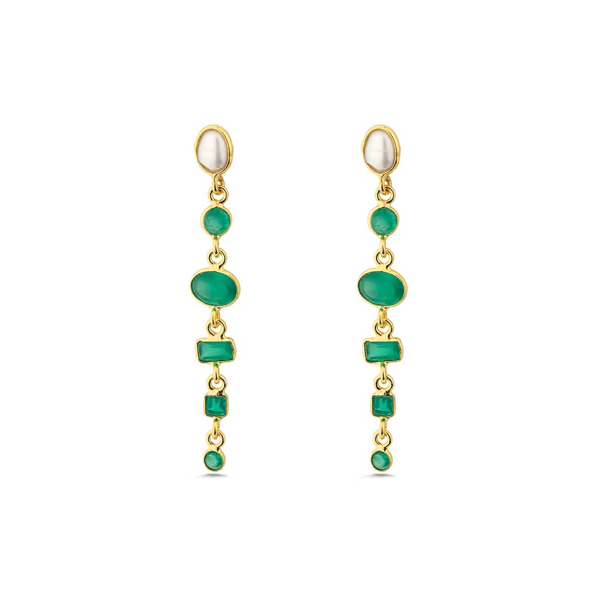 Pearl Blue Topaz & Green Onyx Dangle Earrings in Gold Plating
