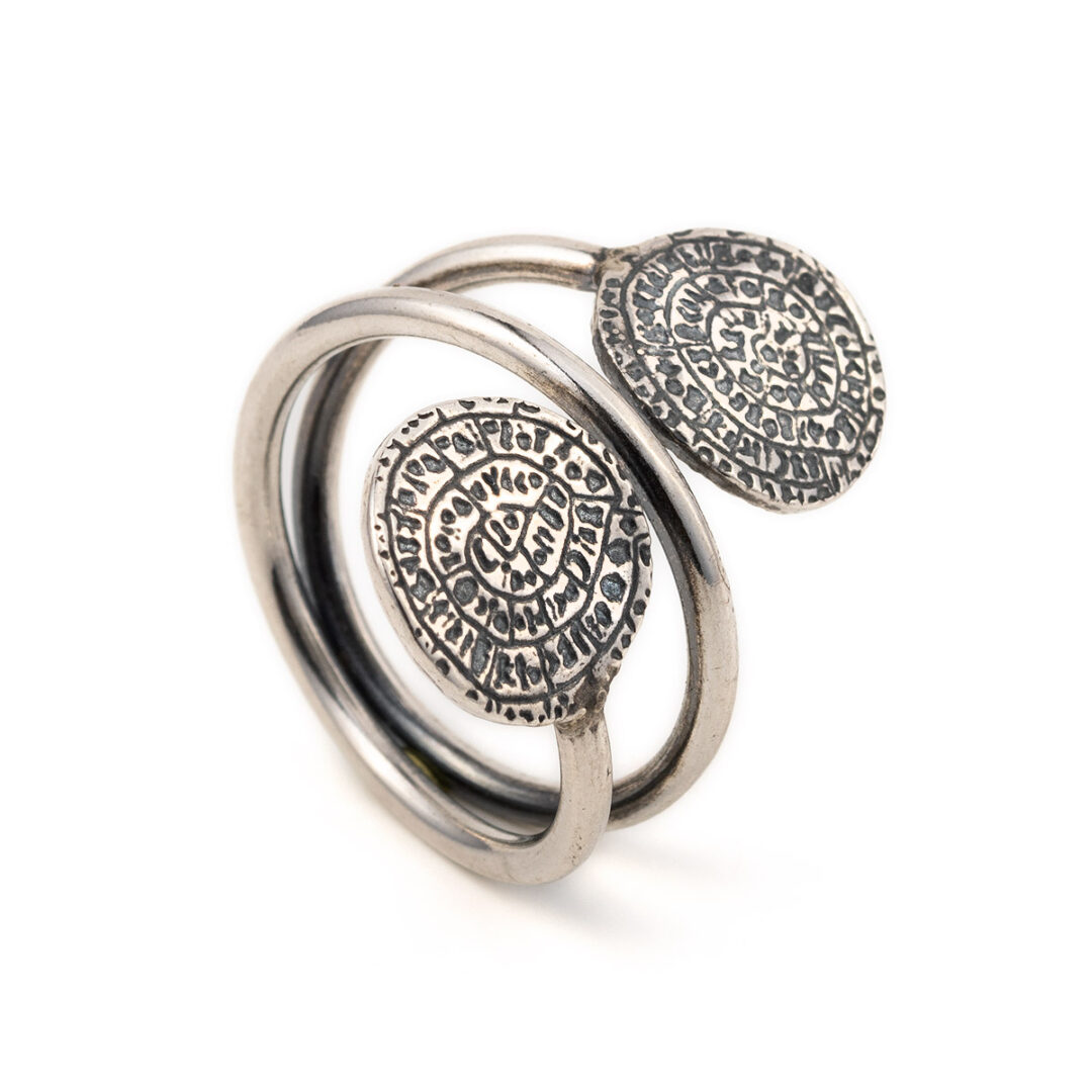This beautiful silver ring represents the disc of Phaistos. The Phaistos Disc is a disk of fired clay from the Minoan palace of Phaistos on the island of Crete. Now, the island of Crete is part of modern Greece. The disc was discovered in 1908 by the Italian archaeologist Luigi Pernier in the Minoan palace-site of Phaistos. While it is not clear that it is a script, most attempted decipherments assume that it is; most additionally assume a syllabary, others an alphabet or logography or a calendar, making it one of the most famous mysteries of archaeology. The disk is about 15 cm in diameter and covered on both sides with a spiral of stamped symbols. The disc features 241 tokens, comprising 45 distinct signs, which were apparently made by pressing hieroglyphic “seals” into a disc of soft clay, in a clockwise sequence spiraling toward the center of the disk. This unique object is now on display at the archaeological museum of Heraklion.