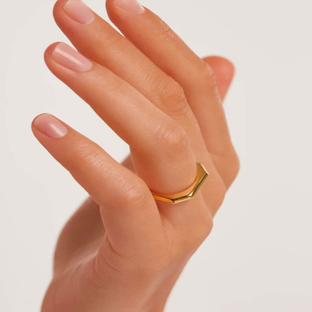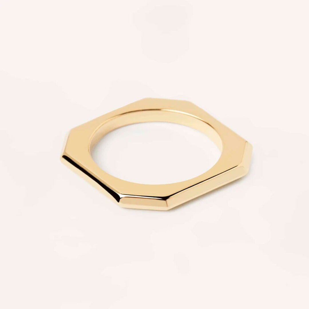 Carefully hand-polished and plated in 3 microns of 18 karat gold, these unique figures present an octagonal exterior that plays with sculpted faceted sides and accentuates the presence of an ovalish rounded interior, a family of elements composing a collection of chain necklaces, bracelets, earrings and a ring that emanate in a rebellious elegance scenario.