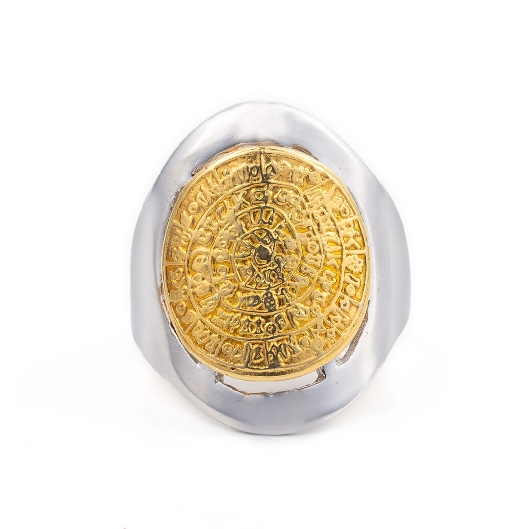This beautiful silver gold plated ring represents the disc of Phaistos. The Phaistos Disc is a disk of fired clay from the Minoan palace of Phaistos on the island of Crete. Now, the island of Crete is part of modern Greece. The disc was discovered in 1908 by the Italian archaeologist Luigi Pernier in the Minoan palace-site of Phaistos. While it is not clear that it is a script, most attempted decipherments assume that it is; most additionally assume a syllabary, others an alphabet or logography or a calendar, making it one of the most famous mysteries of archaeology. The disk is about 15 cm in diameter and covered on both sides with a spiral of stamped symbols. The disc features 241 tokens, comprising 45 distinct signs, which were apparently made by pressing hieroglyphic “seals” into a disc of soft clay, in a clockwise sequence spiraling toward the center of the disk. This unique object is now on display at the archaeological museum of Heraklion.