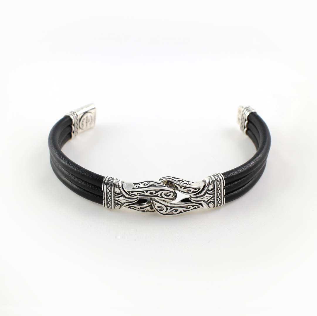It features three rows of smooth black leather cords with an engraved sterling silver clasp to hold them in place. The unique rope knot station in the front is etched with a free flow design in sterling silver with darkened crevices.